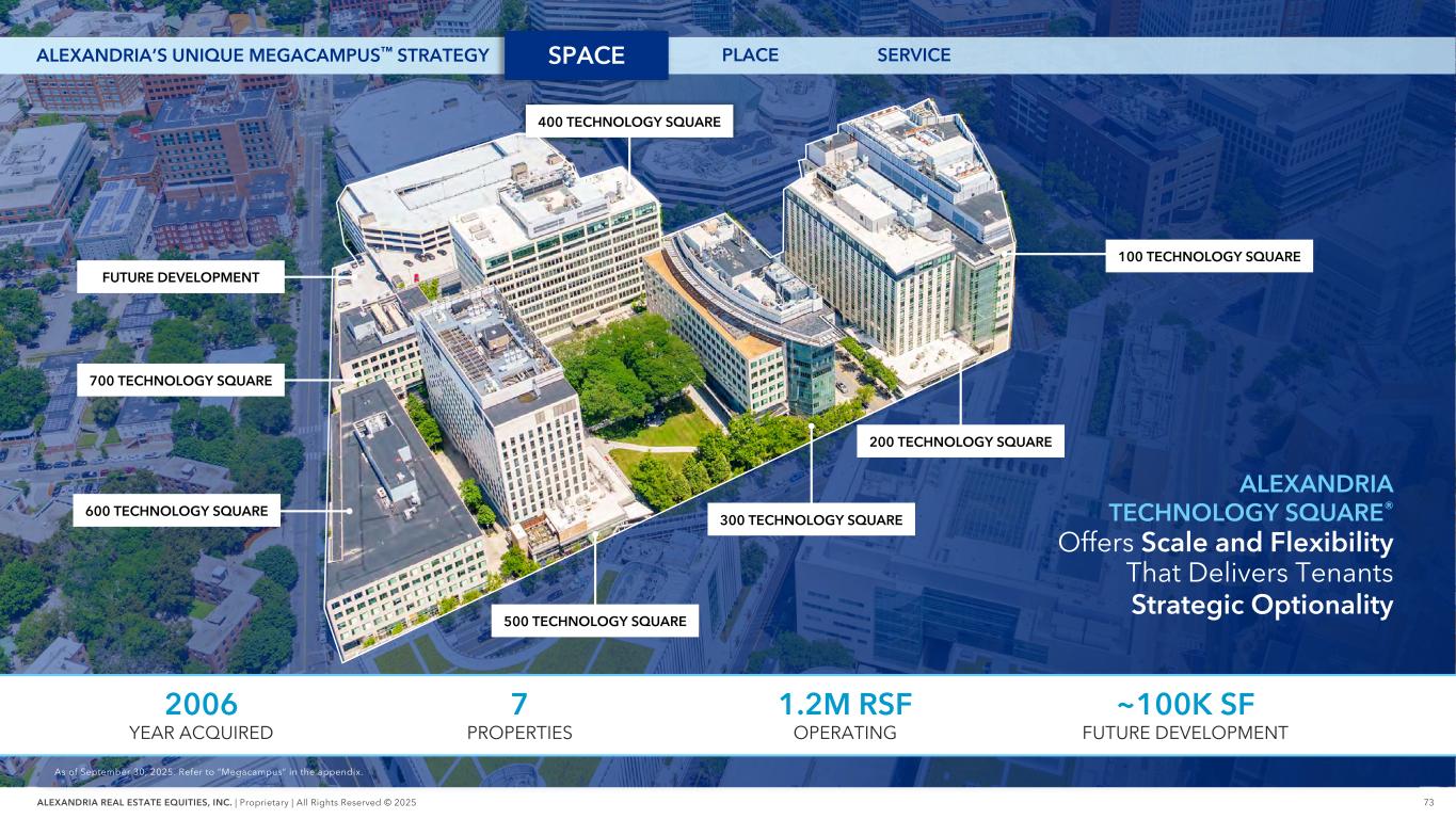 72ALEXANDRIA REAL ESTATE EQUITIES, INC. | Proprietary | All Rights Reserved © 2025 Refer to "Megacampus" in the appendix. Alexandria Technology Square® ALEXANDRIA’S UNIQUE MEGACAMPUS™ STRATEGY DELIVERS DIFFERENTIATED ECOSYSTEMS SPACE | PLACE | SERVICE