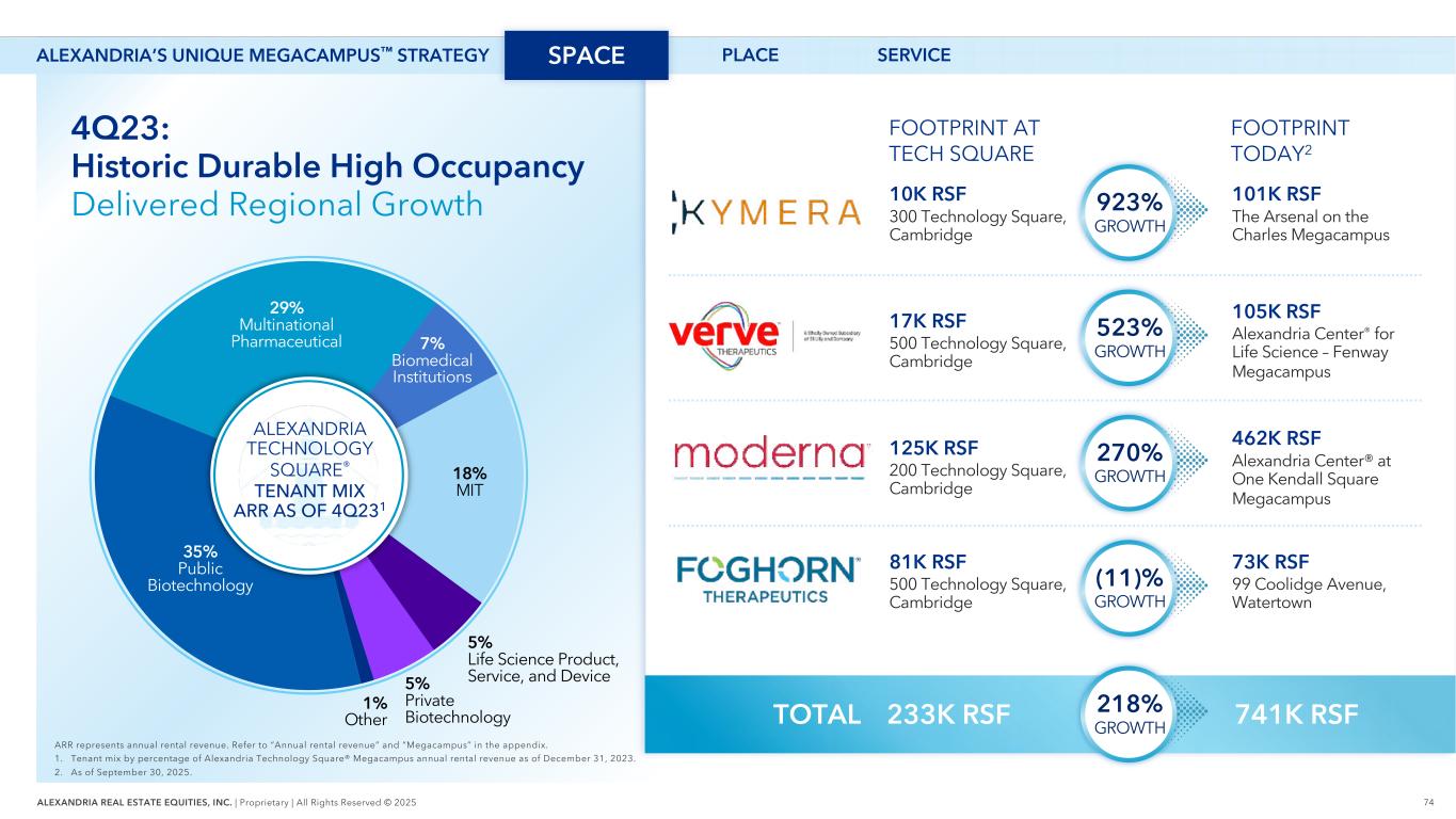 73ALEXANDRIA REAL ESTATE EQUITIES, INC. | Proprietary | All Rights Reserved © 2025 400 TECHNOLOGY SQUARE 200 TECHNOLOGY SQUARE 2006 YEAR ACQUIRED 7 PROPERTIES 1.2M RSF OPERATING ~100K SF FUTURE DEVELOPMENT ALEXANDRIA TECHNOLOGY SQUARE® Offers Scale and Flexibility That Delivers Tenants Strategic Optionality As of September 30, 2025. Refer to “Megacampus” in the appendix. SPACE PLACE SERVICEALEXANDRIA’S UNIQUE MEGACAMPUS™ STRATEGY 100 TECHNOLOGY SQUARE 700 TECHNOLOGY SQUARE 600 TECHNOLOGY SQUARE FUTURE DEVELOPMENT 500 TECHNOLOGY SQUARE 300 TECHNOLOGY SQUARE
