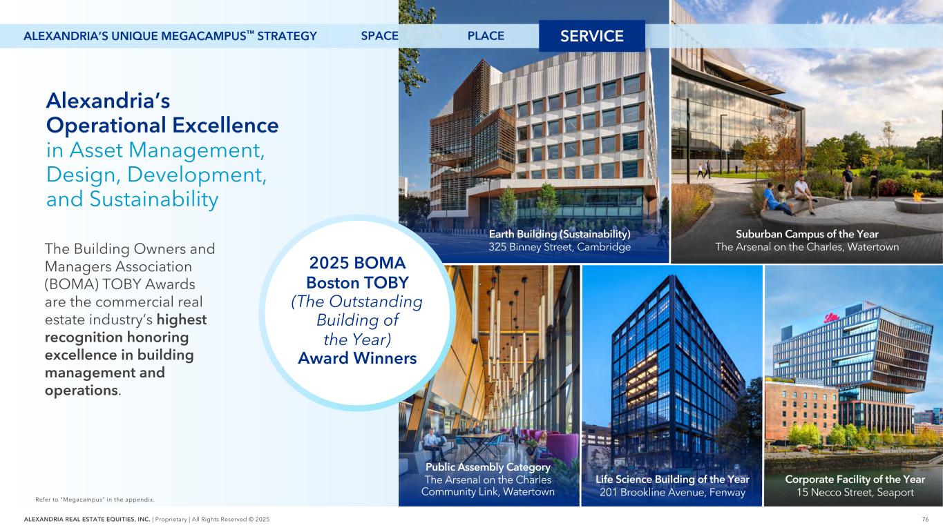 75ALEXANDRIA REAL ESTATE EQUITIES, INC. | Proprietary | All Rights Reserved © 2025 Alexandria’s Curated Technology Square Ecosystem Designed to Recruit & Retain Top Talent, Ignite Collaboration, and Catalyze Innovation We’re not here just to gain new knowledge; we’re here to transfer that new knowledge into useful things. It’s what made Kendall Square Kendall Square.” PHILLIP SHARP Nobel Laureate and Co-Founder of Biogen ALEXANDRIA’S UNIQUE MEGACAMPUS™ STRATEGY SPACE PLACE SERVICE Refer to “Megacampus” in the appendix.