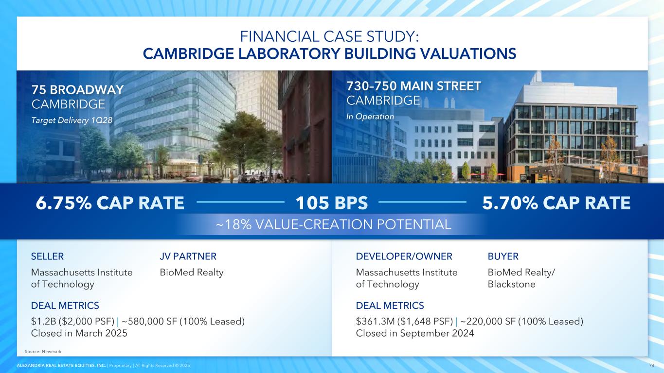 77ALEXANDRIA REAL ESTATE EQUITIES, INC. | Proprietary | All Rights Reserved © 2025 As of September 30, 2025. Refer to “Megacampus” and “Net operating income, net operating income (cash basis), and operating margin” in the appendix. 1. Value-creation margin calculated as gain divided by gross book value plus unamortized ground lease right-of-use asset as of September 30, 2025. Gain calculated as follows: (a) net operating income (cash basis) for the three months ended September 30, 2025 annualized divided by the submarket capitalization rate of 5.7% as of September 30, 2025 less (b) net book value plus unamortized ground lease right-of-use asset as of September 30, 2025. ALEXANDRIA TECHNOLOGY SQUARE’S STRONG FINANCIAL PERFORMANCE VALUE- CREATION MARGIN1 79% Year Acquired 2006 Cash NOI Growth Since Acquisition 313%