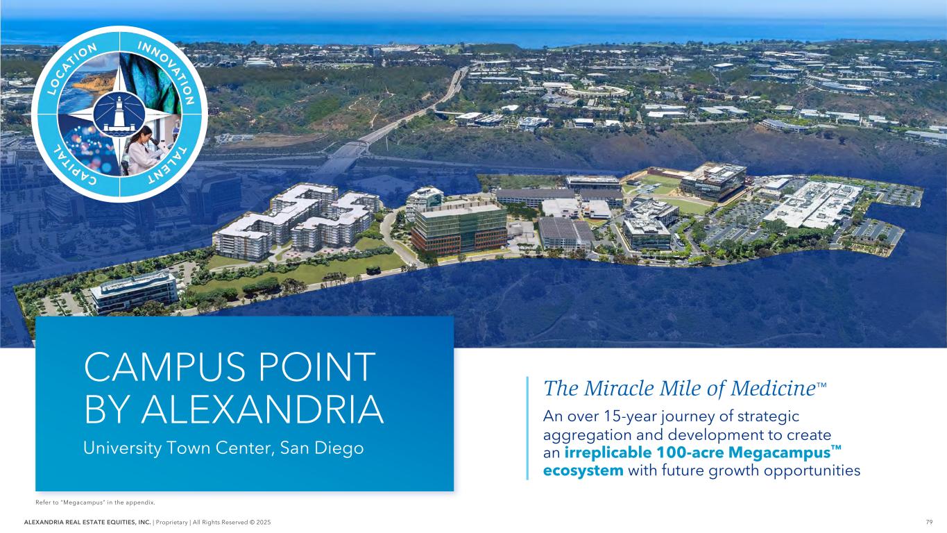 79ALEXANDRIA REAL ESTATE EQUITIES, INC. | Proprietary | All Rights Reserved © 2025 Refer to “Megacampus” in the appendix. The Miracle Mile of Medicine™ An over 15-year journey of strategic aggregation and development to create an irreplicable 100-acre Megacampus™ ecosystem with future growth opportunities CAMPUS POINT BY ALEXANDRIA University Town Center, San Diego