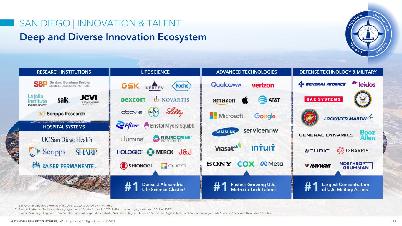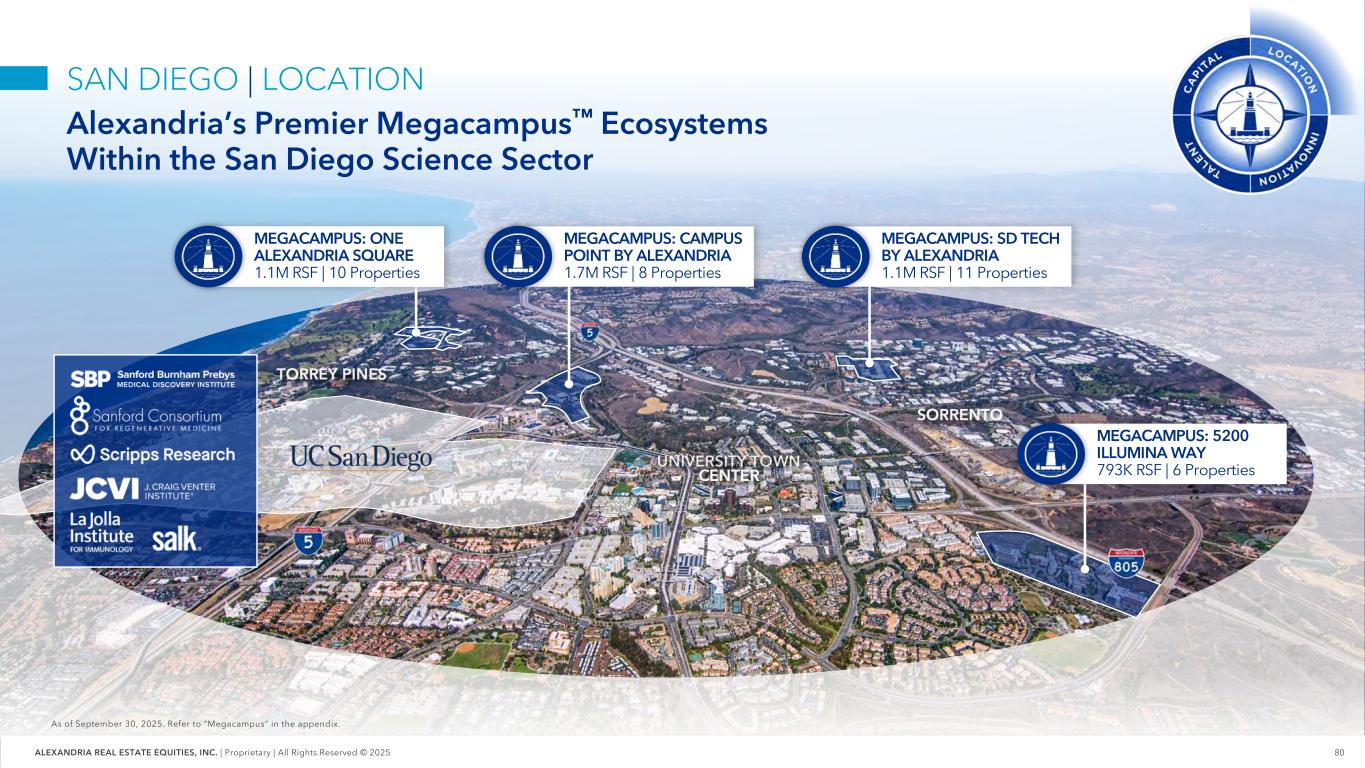 80ALEXANDRIA REAL ESTATE EQUITIES, INC. | Proprietary | All Rights Reserved © 2025 MEGACAMPUS: ONE ALEXANDRIA SQUARE 1.1M RSF | 10 Properties MEGACAMPUS: CAMPUS POINT BY ALEXANDRIA 1.7M RSF | 8 Properties MEGACAMPUS: SD TECH BY ALEXANDRIA 1.1M RSF | 11 Properties MEGACAMPUS: 5200 ILLUMINA WAY 793K RSF | 6 Properties SAN DIEGO | LOCATION Alexandria’s Premier Megacampus™ Ecosystems Within the San Diego Science Sector As of September 30, 2025. Refer to “Megacampus” in the appendix.