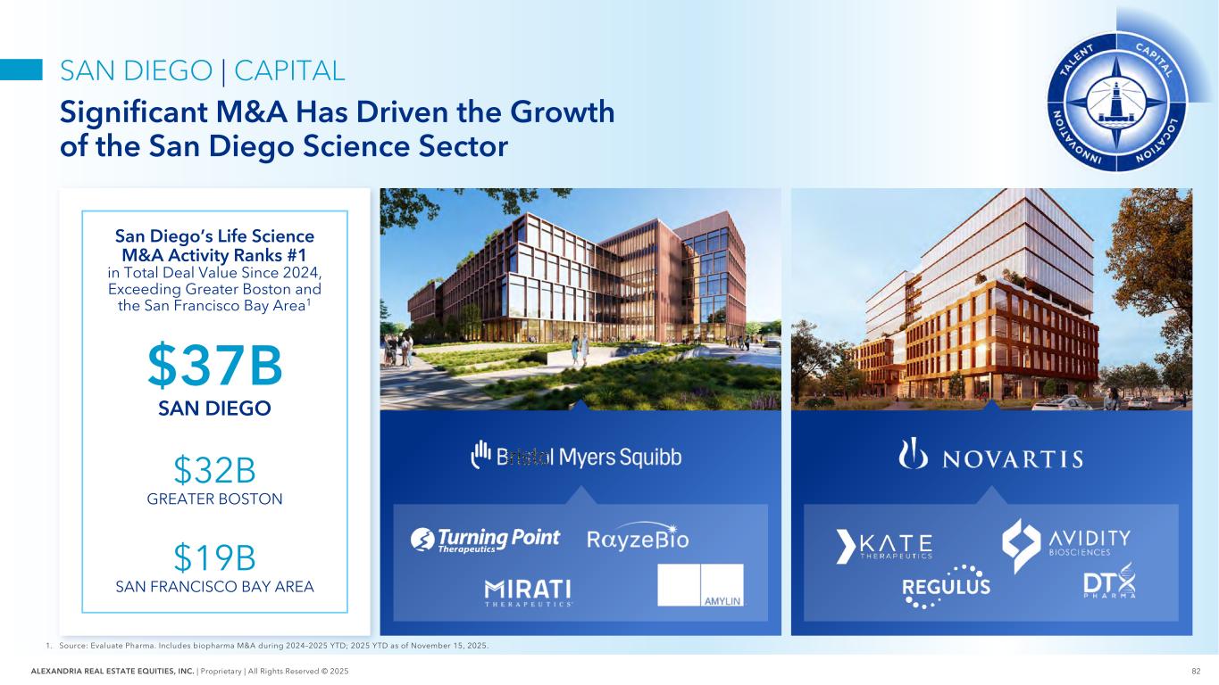 81ALEXANDRIA REAL ESTATE EQUITIES, INC. | Proprietary | All Rights Reserved © 2025 SAN DIEGO | INNOVATION & TALENT Deep and Diverse Innovation Ecosystem 1. Based on geographic proximity of life science assets owned by Alexandria. 2. Source: LinkedIn, ”Tech talent is surging in these 15 cities,” June 8, 2022. Reflects percentage growth from 2019 to 2022. 3. Source: San Diego Regional Economic Development Corporation website, “About the Region: Defense,” ”About the Region: Tech,” and ”About the Region: Life Sciences,” accessed November 13, 2025. HOSPITAL SYSTEMS RESEARCH INSTITUTIONS LIFE SCIENCE ADVANCED TECHNOLOGIES DEFENSE TECHNOLOGY & MILITARY #1 Densest Alexandria Life Science Cluster1 #1 Fastest-Growing U.S. Metro in Tech Talent2 #1 Largest Concentration of U.S. Military Assets3