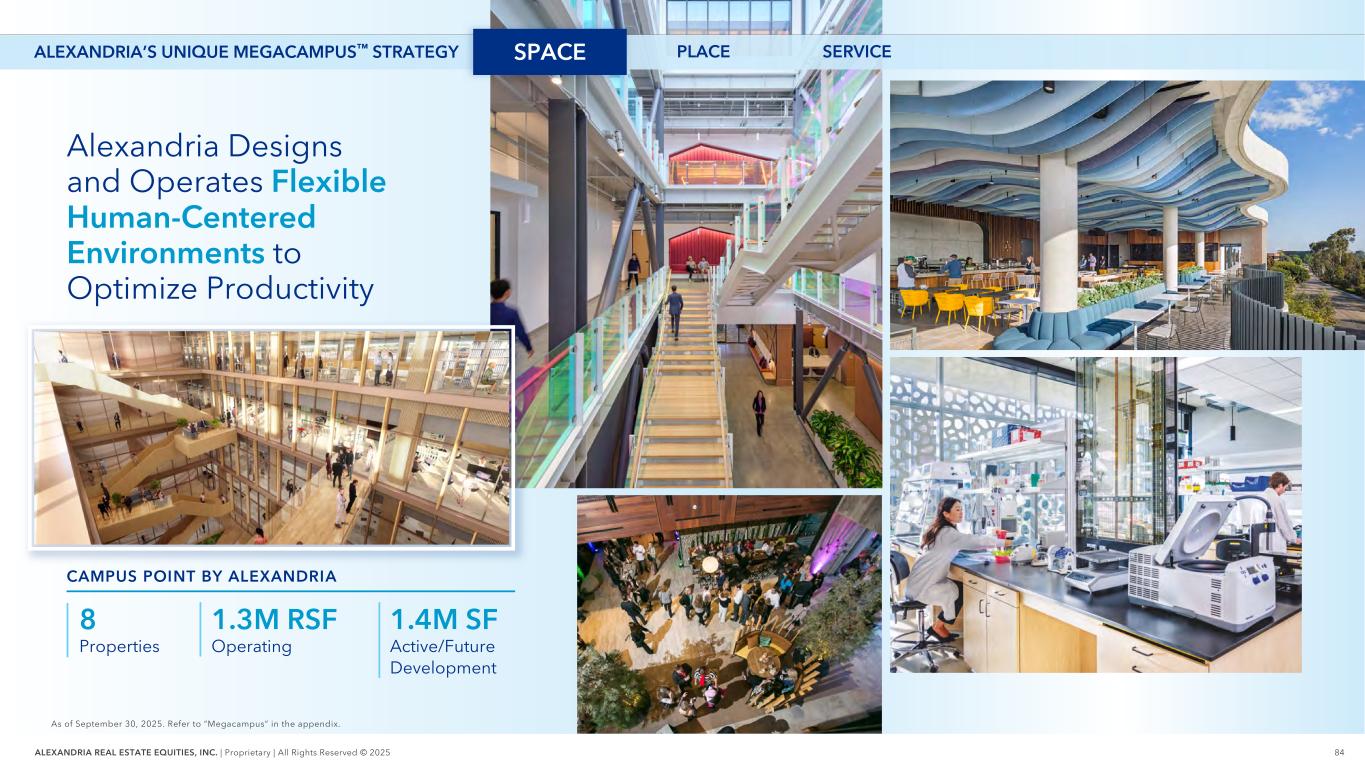 83ALEXANDRIA REAL ESTATE EQUITIES, INC. | Proprietary | All Rights Reserved © 2025 Campus Point by Alexandria ALEXANDRIA’S UNIQUE MEGACAMPUS™ STRATEGY DELIVERS DIFFERENTIATED ECOSYSTEMS SPACE | PLACE | SERVICE Refer to "Megacampus" in the appendix.