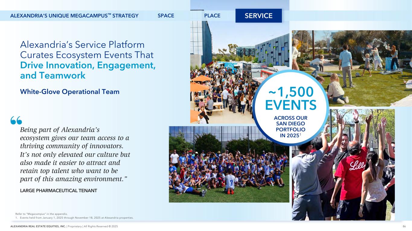 85ALEXANDRIA REAL ESTATE EQUITIES, INC. | Proprietary | All Rights Reserved © 2025 Refer to "Megacampus" in the appendix. Campus Point Provides an Unmatched Campus Experience That Enables Tenants to Recruit and Retain Top Talent There is no way anyone would ever go back to any other real estate group after having access to all these amenities with ARE.” LARGE PHARMACEUTICAL TENANT ALEXANDRIA’S UNIQUE MEGACAMPUS™ STRATEGY SPACE PLACE SERVICE