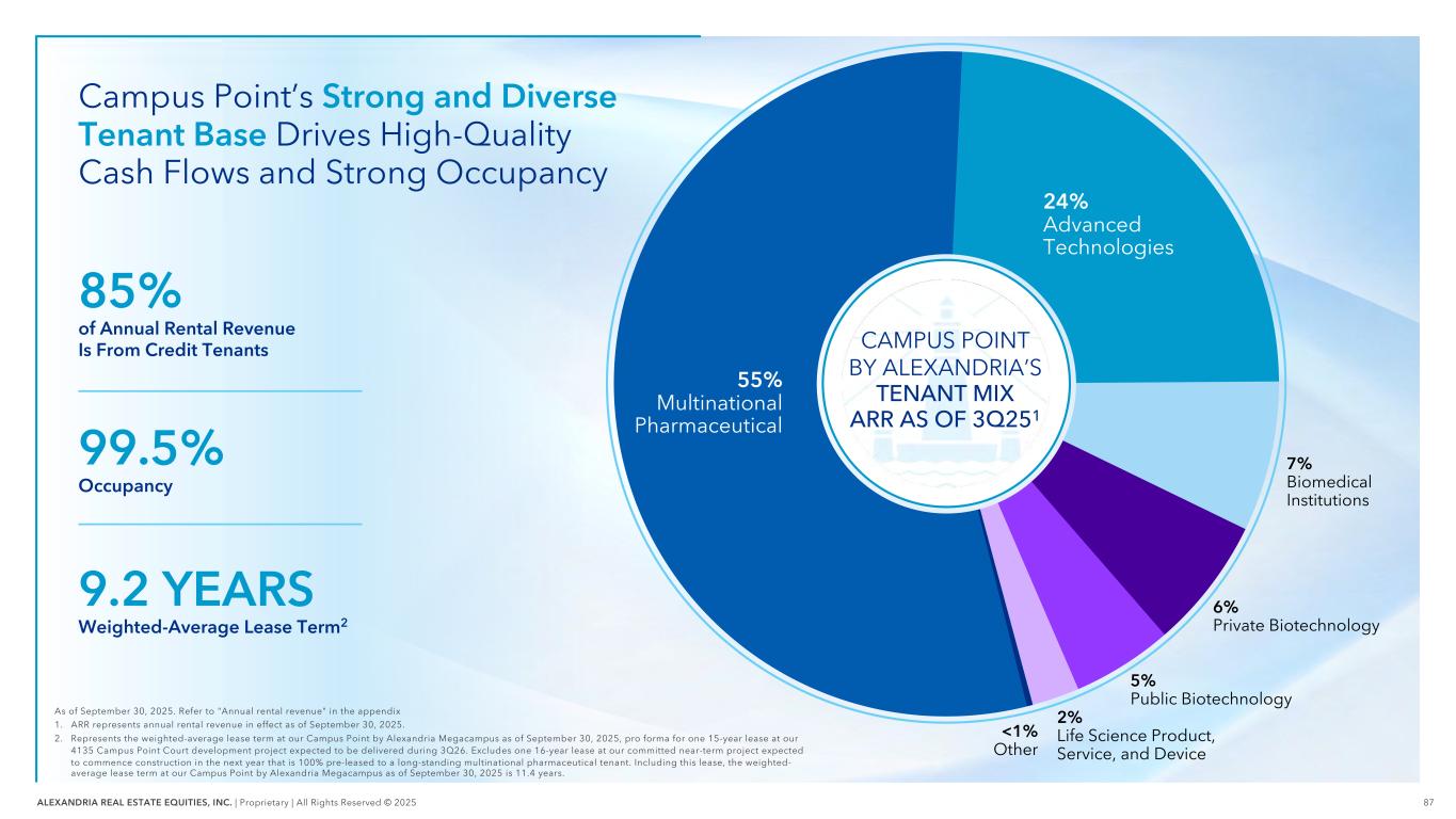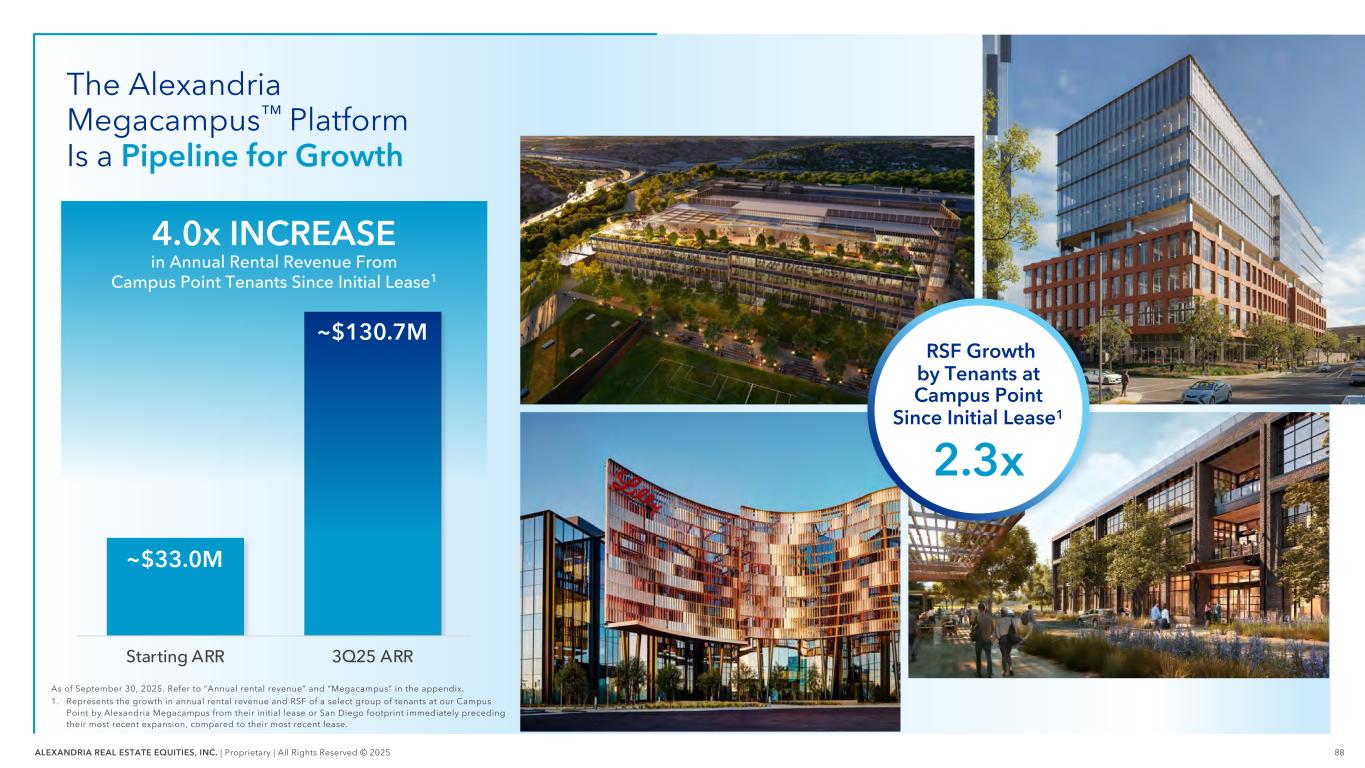 87ALEXANDRIA REAL ESTATE EQUITIES, INC. | Proprietary | All Rights Reserved © 2025 As of September 30, 2025. Refer to "Annual rental revenue" in the appendix 1. ARR represents annual rental revenue in effect as of September 30, 2025. 2. Represents the weighted-average lease term at our Campus Point by Alexandria Megacampus as of September 30, 2025, pro forma for one 15-year lease at our 4135 Campus Point Court development project expected to be delivered during 3Q26. Excludes one 16-year lease at our committed near-term project expected to commence construction in the next year that is 100% pre-leased to a long-standing multinational pharmaceutical tenant. Including this lease, the weighted- average lease term at our Campus Point by Alexandria Megacampus as of September 30, 2025 is 11.4 years. Campus Point’s Strong and Diverse Tenant Base Drives High-Quality Cash Flows and Strong Occupancy 24% Advanced Technologies 99.5% Occupancy 9.2 YEARS Weighted-Average Lease Term2 85% of Annual Rental Revenue Is From Credit Tenants 55% Multinational Pharmaceutical CAMPUS POINT BY ALEXANDRIA’S TENANT MIX ARR AS OF 3Q251 7% Biomedical Institutions 6% Private Biotechnology 5% Public Biotechnology 2% Life Science Product, Service, and Device <1% Other