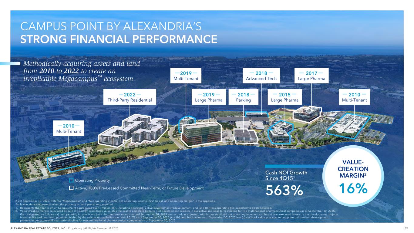 88ALEXANDRIA REAL ESTATE EQUITIES, INC. | Proprietary | All Rights Reserved © 2025 As of September 30, 2025. Refer to “Annual rental revenue” and “Megacampus” in the appendix. 1. Represents the growth in annual rental revenue and RSF of a select group of tenants at our Campus Point by Alexandria Megacampus from their initial lease or San Diego footprint immediately preceding their most recent expansion, compared to their most recent lease. The Alexandria Megacampus™ Platform Is a Pipeline for Growth Starting ARR 3Q25 ARR ~$33.0M ~$130.7M 4.0x INCREASE in Annual Rental Revenue From Campus Point Tenants Since Initial Lease1 RSF Growth by Tenants at Campus Point Since Initial Lease1 2.3x