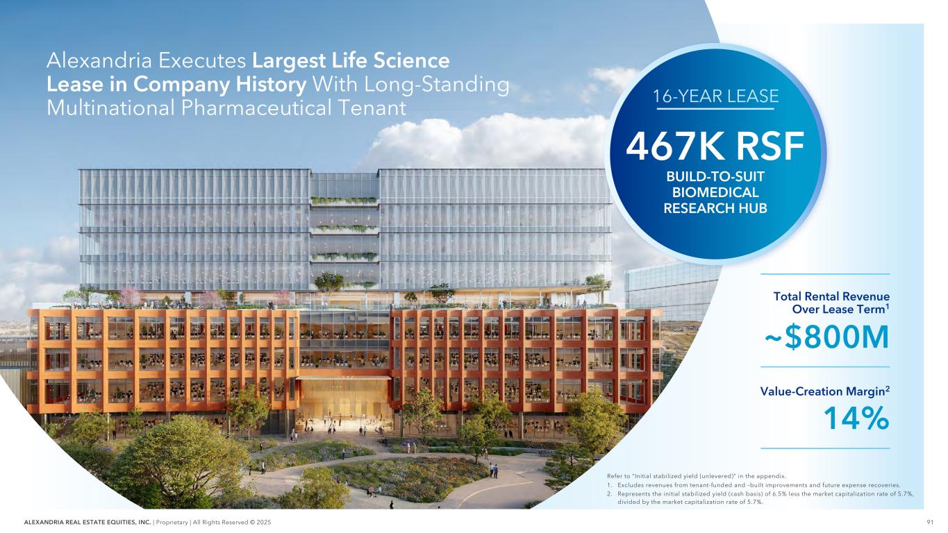 91ALEXANDRIA REAL ESTATE EQUITIES, INC. | Proprietary | All Rights Reserved © 2025 Refer to “Initial stabilized yield (unlevered)” in the appendix. 1. Excludes revenues from tenant-funded and –built improvements and future expense recoveries. 2. Represents the initial stabilized yield (cash basis) of 6.5% less the market capitalization rate of 5.7%, divided by the market capitalization rate of 5.7%. Total Rental Revenue Over Lease Term1 ~$800M Alexandria Executes Largest Life Science Lease in Company History With Long-Standing Multinational Pharmaceutical Tenant 16-YEAR LEASE 467K RSF BUILD-TO-SUIT BIOMEDICAL RESEARCH HUB Value-Creation Margin2 14%