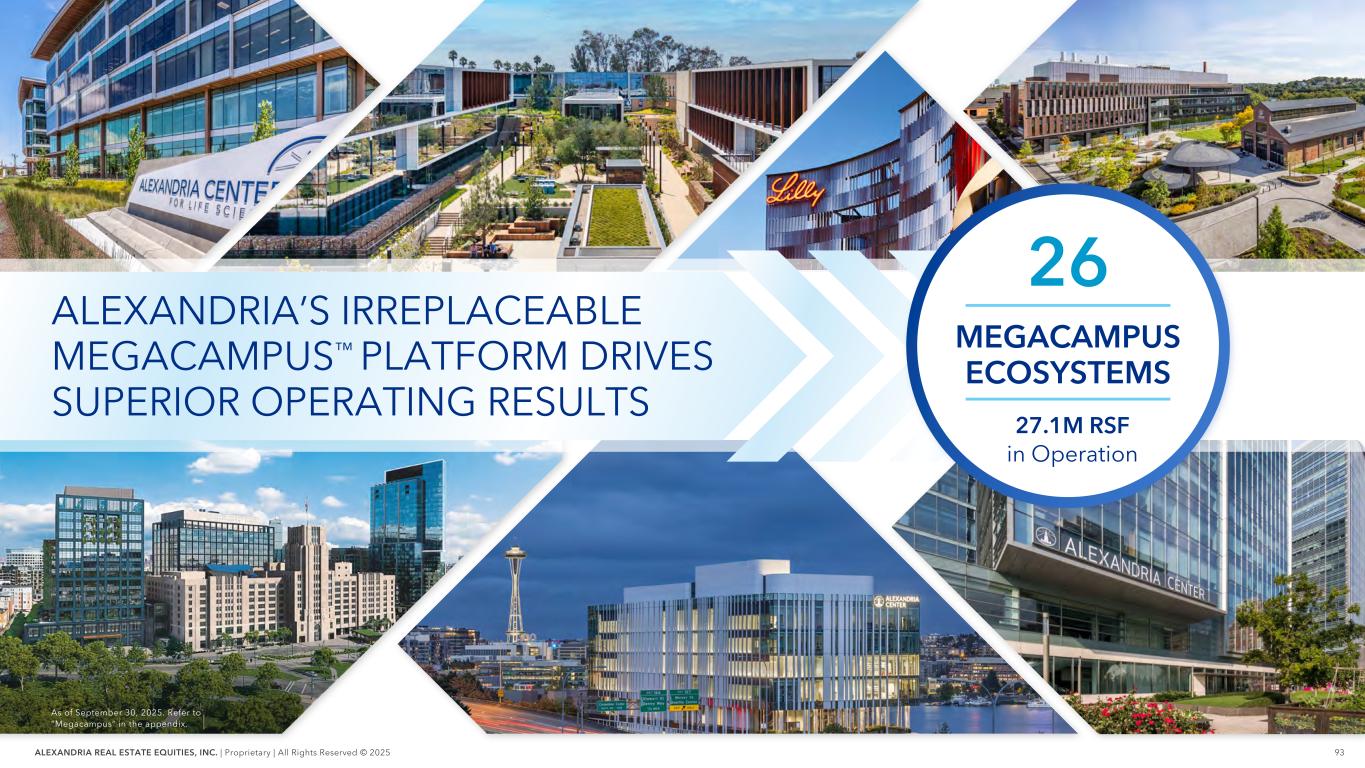 93ALEXANDRIA REAL ESTATE EQUITIES, INC. | Proprietary | All Rights Reserved © 2025 ALEXANDRIA’S IRREPLACEABLE MEGACAMPUS™ PLATFORM DRIVES SUPERIOR OPERATING RESULTS 26 MEGACAMPUS ECOSYSTEMS As of September 30, 2025. Refer to “Megacampus” in the appendix. 27.1M RSF in Operation