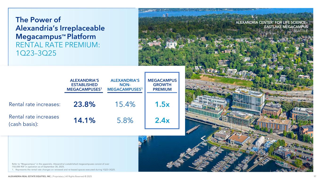 96ALEXANDRIA REAL ESTATE EQUITIES, INC. | Proprietary | All Rights Reserved © 2025 ALEXANDRIA’S PROPRIETARY ALGORITHM Driving Our Differentiated Megacampus™ Strategy CLUSTERING: THE DNA of the LIFE SCIENCE INDUSTRY THE DNA of the ALEXANDRIA MEGACAMPUS PLATFORM A L E X A N D R I A ’ S IRREPLACEABLE P L A T F O R M