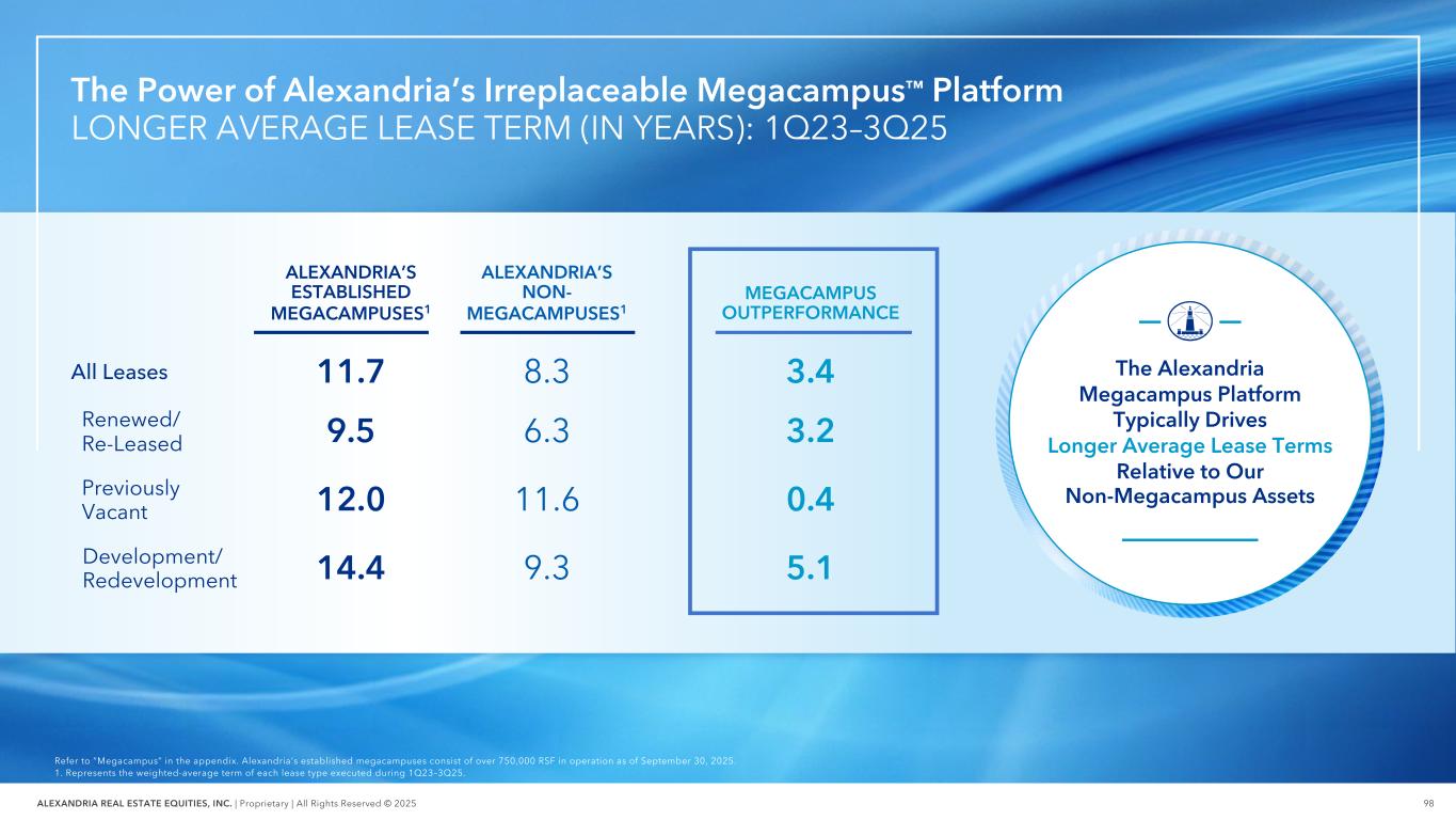 97ALEXANDRIA REAL ESTATE EQUITIES, INC. | Proprietary | All Rights Reserved © 2025 Refer to “Megacampus” in the appendix. Alexandria’s established megacampuses consist of over 750,000 RSF in operation as of September 30, 2025. 1. Represents the rental rate changes on renewed and re-leased spaces executed during 1Q23–3Q25. ALEXANDRIA’S ESTABLISHED MEGACAMPUSES1 ALEXANDRIA’S NON- MEGACAMPUSES1 MEGACAMPUS GROWTH PREMIUM Rental rate increases: 23.8% 15.4% 1.5x Rental rate increases (cash basis): 14.1% 5.8% 2.4x ALEXANDRIA CENTER® FOR LIFE SCIENCE – EASTLAKE MEGACAMPUS SEATTLE The Power of Alexandria’s Irreplaceable Megacampus™ Platform RENTAL RATE PREMIUM: 1Q23–3Q25