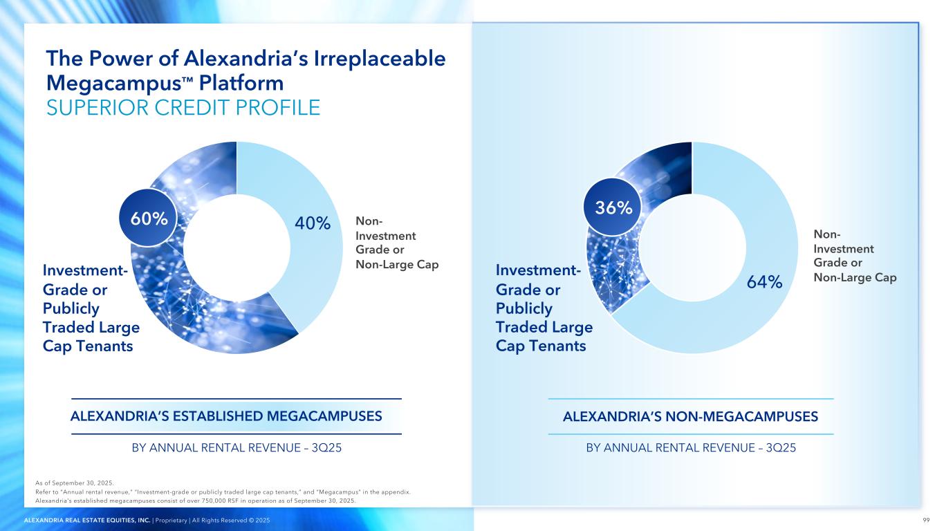 98ALEXANDRIA REAL ESTATE EQUITIES, INC. | Proprietary | All Rights Reserved © 2025 Refer to “Megacampus” in the appendix. Alexandria’s established megacampuses consist of over 750,000 RSF in operation as of September 30, 2025. 1. Represents the weighted-average term of each lease type executed during 1Q23–3Q25. ALEXANDRIA’S ESTABLISHED MEGACAMPUSES1 ALEXANDRIA’S NON- MEGACAMPUSES1 MEGACAMPUS OUTPERFORMANCE All Leases 11.7 8.3 3.4 Renewed/ Re-Leased 9.5 6.3 3.2 Previously Vacant 12.0 11.6 0.4 Development/ Redevelopment 14.4 9.3 5.1 The Alexandria Megacampus Platform Typically Drives Longer Average Lease Terms Relative to Our Non-Megacampus Assets The Power of Alexandria’s Irreplaceable Megacampus™ Platform LONGER AVERAGE LEASE TERM (IN YEARS): 1Q23–3Q25