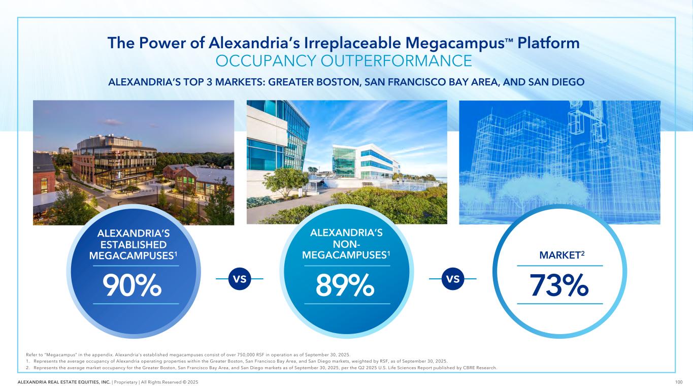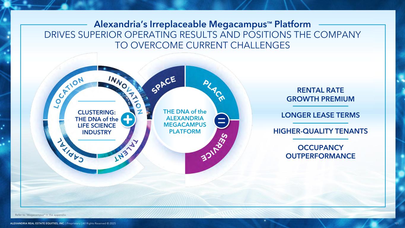 100ALEXANDRIA REAL ESTATE EQUITIES, INC. | Proprietary | All Rights Reserved © 2025 The Power of Alexandria’s Irreplaceable Megacampus™ Platform OCCUPANCY OUTPERFORMANCE Refer to “Megacampus” in the appendix. Alexandria’s established megacampuses consist of over 750,000 RSF in operation as of September 30, 2025. 1. Represents the average occupancy of Alexandria operating properties within the Greater Boston, San Francisco Bay Area, and San Diego markets, weighted by RSF, as of September 30, 2025. 2. Represents the average market occupancy for the Greater Boston, San Francisco Bay Area, and San Diego markets as of September 30, 2025, per the Q2 2025 U.S. Life Sciences Report published by CBRE Research. 90% 89% ALEXANDRIA’S ESTABLISHED MEGACAMPUSES1 ALEXANDRIA’S NON- MEGACAMPUSES1 vs vs ALEXANDRIA’S TOP 3 MARKETS: GREATER BOSTON, SAN FRANCISCO BAY AREA, AND SAN DIEGO 73% MARKET2