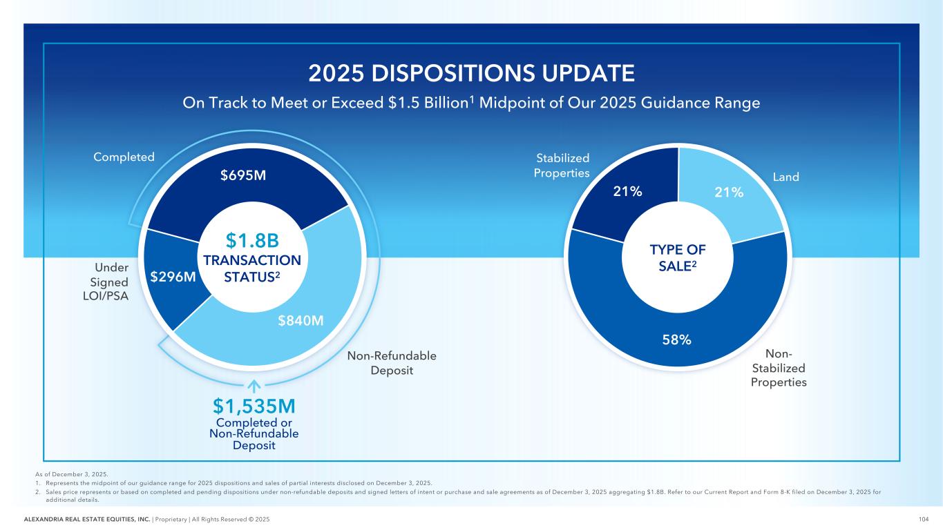 103ALEXANDRIA REAL ESTATE EQUITIES, INC. | Proprietary | All Rights Reserved © 2025 2025 FFO Per Share Midpoint of $9.011 Occupancy Range as of 12/31/25 of 90.0% to 91.6% ~$1.5B of Dispositions of Non-Core Assets (Land, Stabilized, and Non-Stabilized) to Recycle Capital2 4Q25 Annualized Leverage Target Range of 5.5x to 6.0x3 G&A Reduction: Down $48M, or 29%, Compared to 20244 Paydown of Debt in 4Q25: ~$41M of Proceeds From Monetization of Non-Real Estate Investments5 2025 GUIDANCE UPDATE 1. Represents the midpoint of our guidance range for 2025 funds from operations per share – diluted, as adjusted, disclosed on December 3, 2025. Refer to “Funds from operations and funds from operations, as adjusted, attributable to Alexandria's common stockholders” in the appendix and our Current Report on Form 8-K filed on December 3, 2025 for additional details. 2. Represents the midpoint of our guidance range for 2025 dispositions and sales of partial interests disclosed on December 3, 2025. 3. Represents our guidance range for net debt and preferred stock to Adjusted EBITDA for 4Q25 annualized disclosed on October 27, 2025. Refer to “Net debt and preferred stock to Adjusted EBITDA“ in the appendix. 4. Based on the midpoint of our guidance range for 2025 general and administrative expenses. 5. We expect to receive proceeds aggregating approximately $41M related to certain non-real estate investments and expect to recognize realized investment losses aggregating approximately $103M in 4Q25, which will be included in 2025 earnings per share and funds from operations and excluded from 2025 funds from operations per share – diluted, as adjusted. Refer to “Funds from operations and funds from operations, as adjusted, attributable to Alexandria’s common stockholders” in the appendix and our Current Report on Form 8-K filed on December 3, 2025 for additional details. 3Q25 2025 INVESTOR DAY Unchanged Unchanged Unchanged Unchanged Unchanged Favorable Update