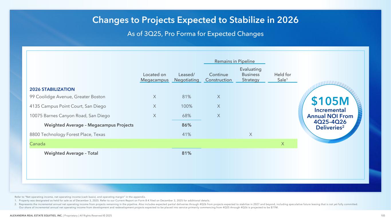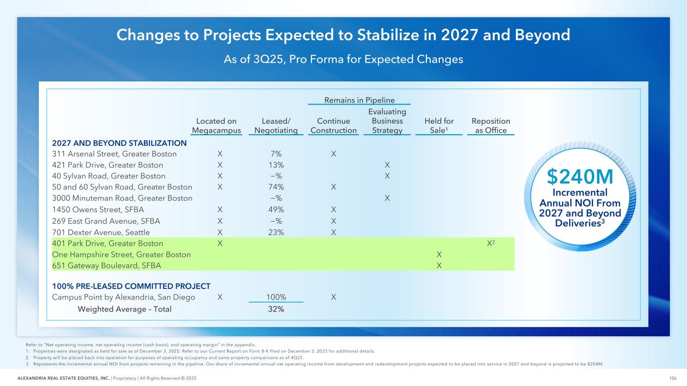 105ALEXANDRIA REAL ESTATE EQUITIES, INC. | Proprietary | All Rights Reserved © 2025 Changes to Projects Expected to Stabilize in 2026 As of 3Q25, Pro Forma for Expected Changes Refer to “Net operating income, net operating income (cash basis), and operating margin” in the appendix. 1. Property was designated as held for sale as of December 3, 2025. Refer to our Current Report on Form 8-K filed on December 3, 2025 for additional details. 2. Represents the incremental annual net operating income from projects remaining in the pipeline. Also includes expected partial deliveries through 4Q26 from projects expected to stabilize in 2027 and beyond, including speculative future leasing that is not yet fully committed. Our share of incremental annual net operating income from development and redevelopment projects expected to be placed into service primarily commencing from 4Q25 through 4Q26 is projected to be $77M. Located on Megacampus Leased/ Negotiating Remains in Pipeline Held for Sale1 Continue Construction Evaluating Business Strategy 2026 STABILIZATION 99 Coolidge Avenue, Greater Boston X 81% X 4135 Campus Point Court, San Diego X 100% X 10075 Barnes Canyon Road, San Diego X 68% X Weighted Average – Megacampus Projects 86% 8800 Technology Forest Place, Texas 41% X Canada X Weighted Average – Total 81% $105M Incremental Annual NOI From 4Q25–4Q26 Deliveries2