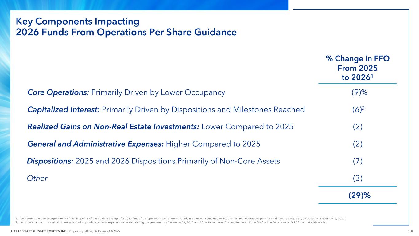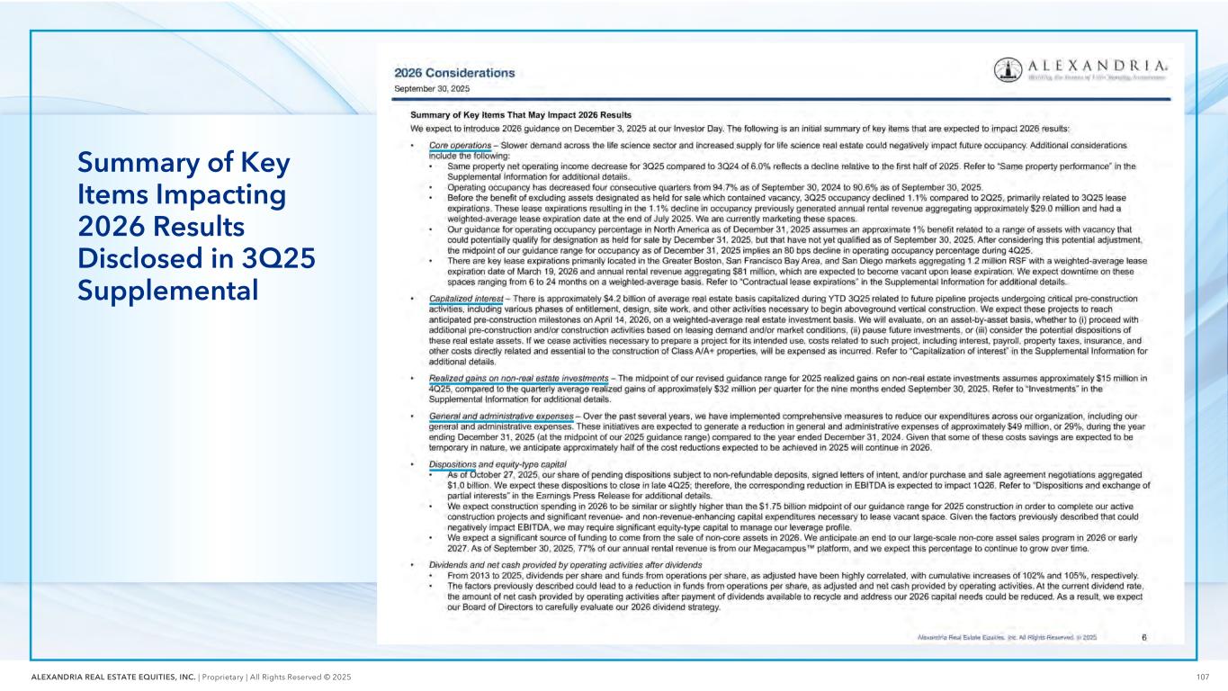 107ALEXANDRIA REAL ESTATE EQUITIES, INC. | Proprietary | All Rights Reserved © 2025 Summary of Key Items Impacting 2026 Results Disclosed in 3Q25 Supplemental