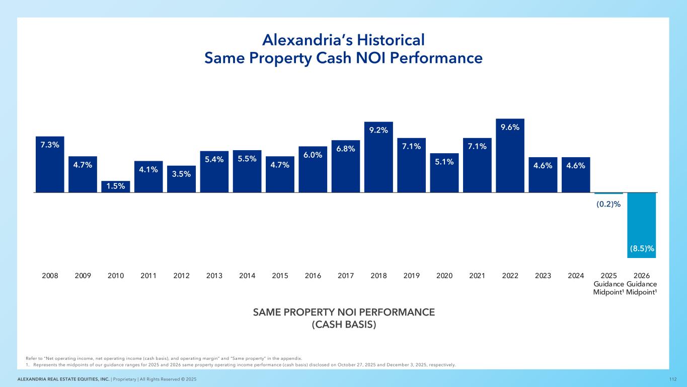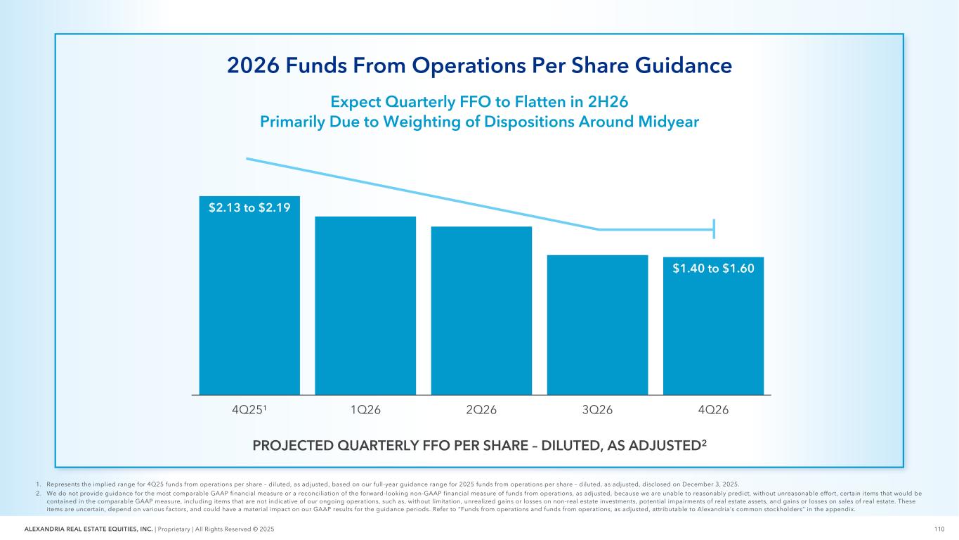 109ALEXANDRIA REAL ESTATE EQUITIES, INC. | Proprietary | All Rights Reserved © 2025 $6.40 MIDPOINT FUNDS FROM OPERATIONS PER SHARE1 $6.25 TO $6.55 2026 GUIDANCE RANGE 1. Represents funds from operations per share – diluted, as adjusted. We do not provide guidance for the most comparable GAAP financial measure or a reconciliation of the forward-looking non-GAAP financial measure of funds from operations, as adjusted, because we are unable to reasonably predict, without unreasonable effort, certain items that would be contained in the comparable GAAP measure, including items that are not indicative of our ongoing operations, such as, without limitation, unrealized gains or losses on non-real estate investments, potential impairments of real estate assets, and gains or losses on sales of real estate. These items are uncertain, depend on various factors, and could have a material impact on our GAAP results for the guidance periods. Refer to “Funds from operations and funds from operations, as adjusted, attributable to Alexandria’s common stockholders” in the appendix and our Current Report on Form 8-K filed on December 3, 2025 for additional details. ALEXANDRIA’S 2026 GUIDANCE FUNDS FROM OPERATIONS PER SHARE