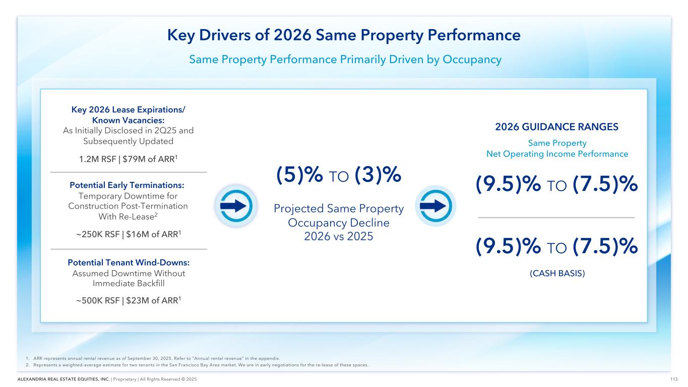 113ALEXANDRIA REAL ESTATE EQUITIES, INC. | Proprietary | All Rights Reserved © 2025 Key Drivers of 2026 Same Property Performance Same Property Performance Primarily Driven by Occupancy 1. ARR represents annual rental revenue as of September 30, 2025. Refer to ”Annual rental revenue" in the appendix. 2. Represents a weighted-average estimate for two tenants in the San Francisco Bay Area market. We are in early negotiations for the re-lease of these spaces. (5)% TO (3)% Projected Same Property Occupancy Decline 2026 vs 2025 (9.5)% TO (7.5)% (9.5)% TO (7.5)% 2026 GUIDANCE RANGES Same Property Net Operating Income Performance (CASH BASIS) Key 2026 Lease Expirations/ Known Vacancies: As Initially Disclosed in 2Q25 and Subsequently Updated 1.2M RSF | $79M of ARR1 Potential Early Terminations: Temporary Downtime for Construction Post-Termination With Re-Lease2 ~250K RSF | $16M of ARR1 Potential Tenant Wind-Downs: Assumed Downtime Without Immediate Backfill ~500K RSF | $23M of ARR1