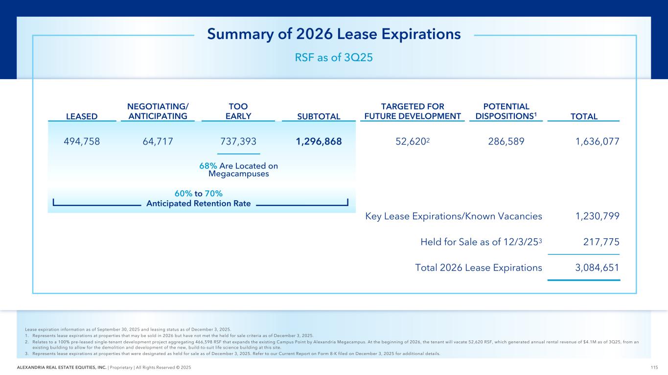 114ALEXANDRIA REAL ESTATE EQUITIES, INC. | Proprietary | All Rights Reserved © 2025 Summary of Key 2026 Lease Expirations/Known Vacancies Lease expiration information as of September 30, 2025 and leasing status as of December 3, 2025. ARR represents annual rental revenue in effect as of September 30, 2025. Refer to “Annual rental revenue” and “Megacampus” in the appendix. 1. Approximately 74% of the 527,049 RSF expiring leases are located on a Megacampus. Initially Disclosed in 2Q25 and Subsequently Updated Lease Expirations/Known Vacancies by ARR (in Thousands) Campus or Property Submarket RSF Located on Megacampus Weighted- Average Expiration Date Negotiating/ Anticipating Tenant From Acquisitions Relocation/ Consolidation Within ARE Portfolio Space Requires Major Renovation/ Other Total Alexandria Stanford Life Science District Greater Stanford 137,970 Jun 2026 $ - $ 12,899 $ - $ - $ 12,899 One Alexandria Square Torrey Pines 118,225 X Jan 2026 4,848 - 5,216 - 10,064 Alexandria Center® at One Kendall Square Cambridge 92,775 X May 2026 - - 4,514 3,269 7,783 9625 Towne Centre Drive University Town Center 163,648 Jan 2026 - - - 6,520 6,520 The Arsenal on the Charles Cambridge/Inner Suburbs 62,142 X Mar 2026 - - 5,300 675 5,975 5810/5820 Nancy Ridge Drive Sorrento Mesa 83,354 Jan 2026 4,621 - - - 4,621 Alexandria Center® at Kendall Square Cambridge 45,636 X Jan 2026 - - - 4,564 4,564 Remaining Various 527,049 (1) Apr 2026 - 7,287 3,544 15,493 26,324 1,230,799 Mar 2026 $ 9,469 $ 20,186 $ 18,574 $ 30,521 $ 78,750 12% 26% 23% 39% 100%