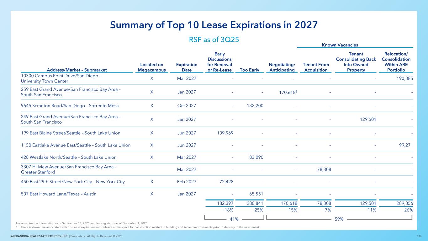 115ALEXANDRIA REAL ESTATE EQUITIES, INC. | Proprietary | All Rights Reserved © 2025 Summary of 2026 Lease Expirations RSF as of 3Q25 Lease expiration information as of September 30, 2025 and leasing status as of December 3, 2025. 1. Represents lease expirations at properties that may be sold in 2026 but have not met the held for sale criteria as of December 3, 2025. 2. Relates to a 100% pre-leased single-tenant development project aggregating 466,598 RSF that expands the existing Campus Point by Alexandria Megacampus. At the beginning of 2026, the tenant will vacate 52,620 RSF, which generated annual rental revenue of $4.1M as of 3Q25, from an existing building to allow for the demolition and development of the new, build-to-suit life science building at this site. 3. Represents lease expirations at properties that were designated as held for sale as of December 3, 2025. Refer to our Current Report on Form 8-K filed on December 3, 2025 for additional details. LEASED NEGOTIATING/ ANTICIPATING TOO EARLY SUBTOTAL TARGETED FOR FUTURE DEVELOPMENT POTENTIAL DISPOSITIONS1 TOTAL 494,758 64,717 737,393 1,296,868 52,6202 286,589 1,636,077 Key Lease Expirations/Known Vacancies 1,230,799 Held for Sale as of 12/3/253 217,775 Total 2026 Lease Expirations 3,084,651 60% to 70% Anticipated Retention Rate 68% Are Located on Megacampuses