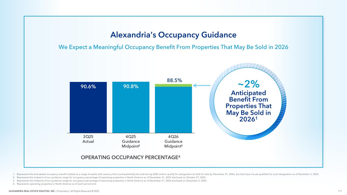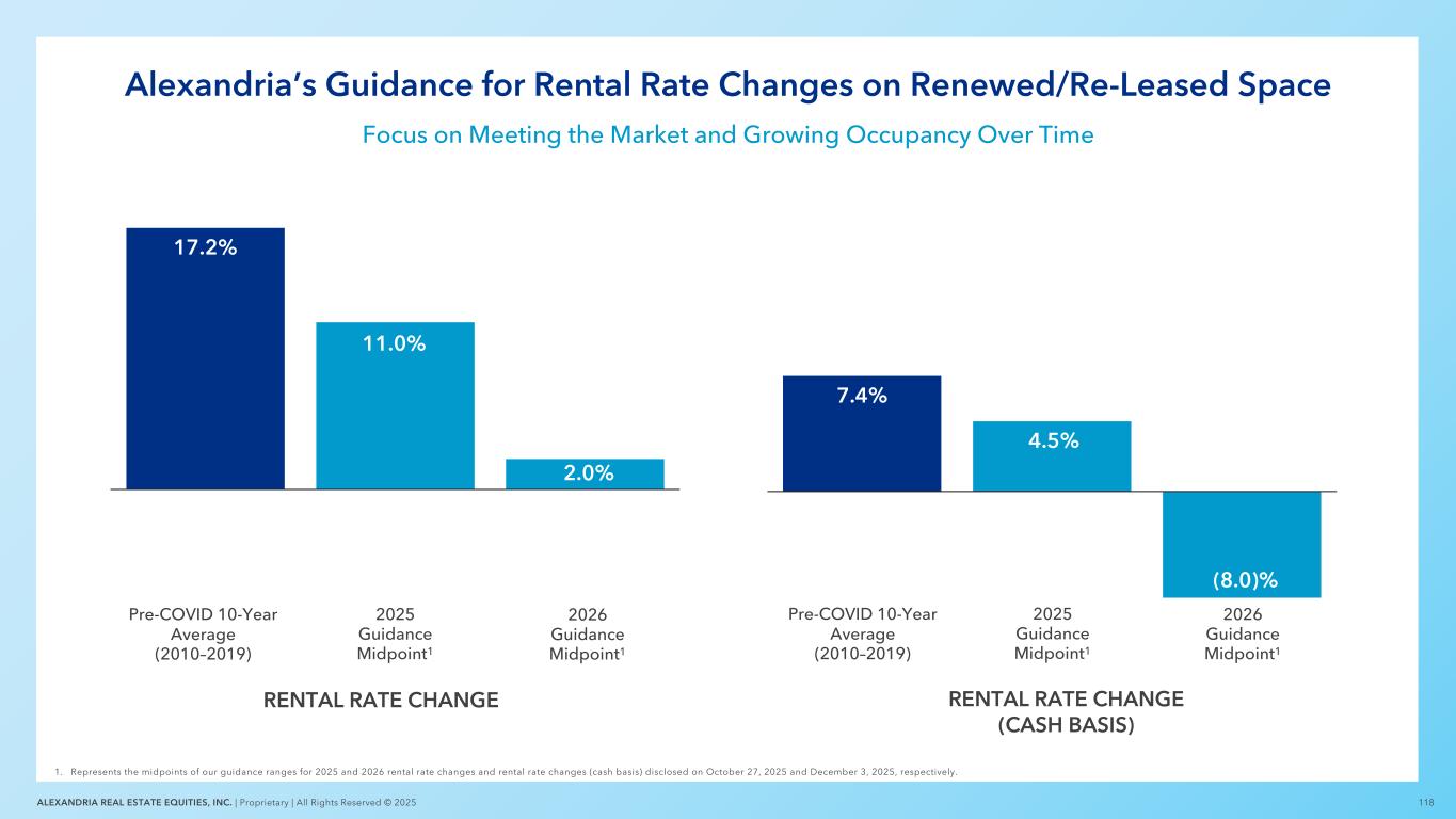 117ALEXANDRIA REAL ESTATE EQUITIES, INC. | Proprietary | All Rights Reserved © 2025 1. Represents the anticipated occupancy benefit related to a range of assets with vacancy that could potentially be sold during 2026 and/or qualify for designation as held for sale by December 31, 2026, but that have not yet qualified for such designation as of December 3, 2025. 2. Represents the midpoint of our guidance range for occupancy percentage of operating properties in North America as of December 31, 2025 disclosed on October 27, 2025. 3. Represents the midpoint of our guidance range for occupancy percentage of operating properties in North America as of December 31, 2026 disclosed on December 3, 2025. 4. Represents operating properties in North America as of each period-end. Alexandria’s Occupancy Guidance We Expect a Meaningful Occupancy Benefit From Properties That May Be Sold in 2026 90.6% 90.8% 88.5% 3Q25 Actual 4Q25 Guidance Midpoint² 4Q26 Guidance Midpoint³ ~2% Anticipated Benefit From Properties That May Be Sold in 20261 OPERATING OCCUPANCY PERCENTAGE4