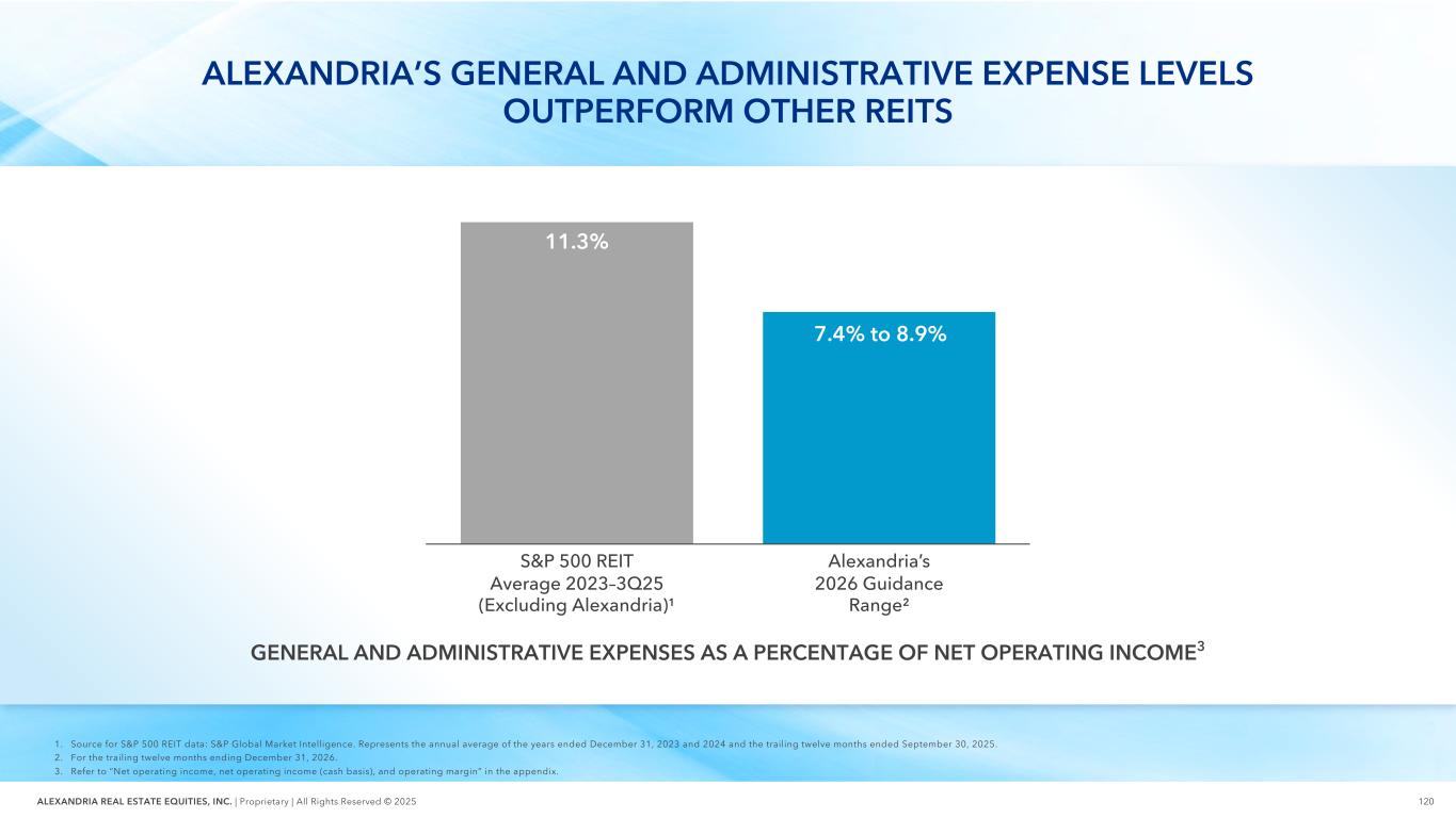 119ALEXANDRIA REAL ESTATE EQUITIES, INC. | Proprietary | All Rights Reserved © 2025 Alexandria’s Continued Successful Management of G&A in 2026 1. Represents or based on the midpoints of our guidance ranges for 2025 and 2026 general and administrative expenses disclosed on October 27, 2025 and December 3, 2025, respectively. GENERAL AND ADMINISTRATION EXPENSES $168M $120M $144M 2024 2025 Guidance Midpoint¹ 2026 Guidance Midpoint¹ o Primarily the result of cost-control and efficiency initiatives related to reducing personnel-related costs and streamlining business processes o Approximately half the 2025 cost savings are expected to be temporary in nature $134M TO $154M 2026 GUIDANCE RANGE $72M Projected Cumulative G&A Savings in 2025 and 2026 Compared to 20241 ALEXANDRIA’S 2026 GUIDANCE GENERAL AND ADMINISTRATION EXPENSES