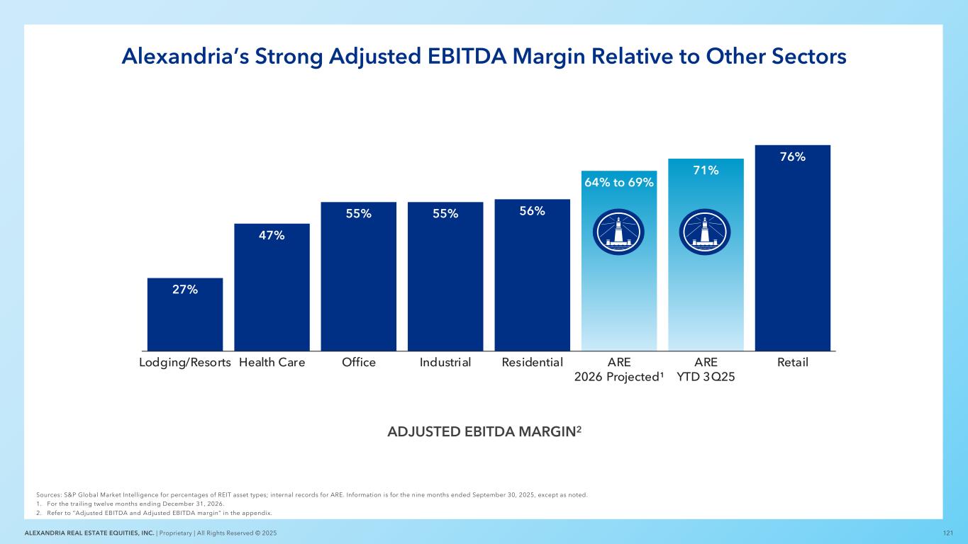 120ALEXANDRIA REAL ESTATE EQUITIES, INC. | Proprietary | All Rights Reserved © 2025 GENERAL AND ADMINISTRATIVE EXPENSES AS A PERCENTAGE OF NET OPERATING INCOME3 ALEXANDRIA’S GENERAL AND ADMINISTRATIVE EXPENSE LEVELS OUTPERFORM OTHER REITS 1. Source for S&P 500 REIT data: S&P Global Market Intelligence. Represents the annual average of the years ended December 31, 2023 and 2024 and the trailing twelve months ended September 30, 2025. 2. For the trailing twelve months ending December 31, 2026. 3. Refer to “Net operating income, net operating income (cash basis), and operating margin” in the appendix. 11.3% 7.4% to 8.9% S&P 500 REIT Average 2023–3Q25 (Excluding Alexandria)¹ Alexandria′s 2026 Guidance Range²