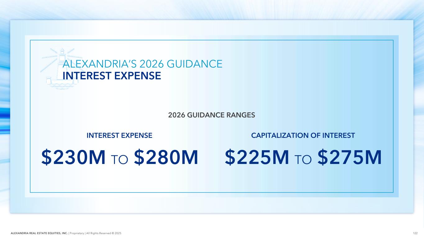 122ALEXANDRIA REAL ESTATE EQUITIES, INC. | Proprietary | All Rights Reserved © 2025 2026 GUIDANCE RANGES $230M TO $280M CAPITALIZATION OF INTEREST $225M TO $275M INTEREST EXPENSE ALEXANDRIA’S 2026 GUIDANCE INTEREST EXPENSE