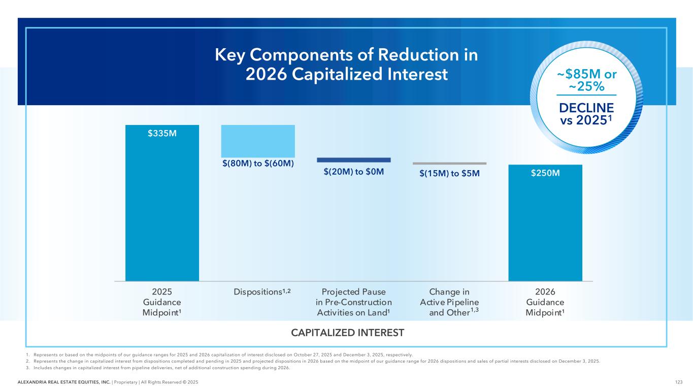 123ALEXANDRIA REAL ESTATE EQUITIES, INC. | Proprietary | All Rights Reserved © 2025 Key Components of Reduction in 2026 Capitalized Interest 1. Represents or based on the midpoints of our guidance ranges for 2025 and 2026 capitalization of interest disclosed on October 27, 2025 and December 3, 2025, respectively. 2. Represents the change in capitalized interest from dispositions completed and pending in 2025 and projected dispositions in 2026 based on the midpoint of our guidance range for 2026 dispositions and sales of partial interests disclosed on December 3, 2025. 3. Includes changes in capitalized interest from pipeline deliveries, net of additional construction spending during 2026. $335M $250M $(80M) to $(60M) $(20M) to $0M $(15M) to $5M 2025 Guidance Midpoint¹ Dispositions Projected Pause in Pre-Construction Activities on Land¹ Change in Active Pipeline and Other 2026 Guidance Midpoint¹ CAPITALIZED INTEREST ~$85M or ~25% DECLINE vs 20251 1,3 1,2