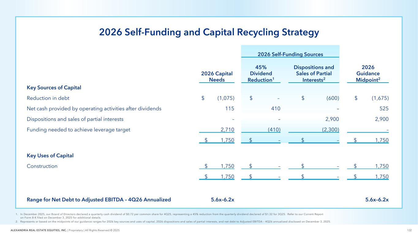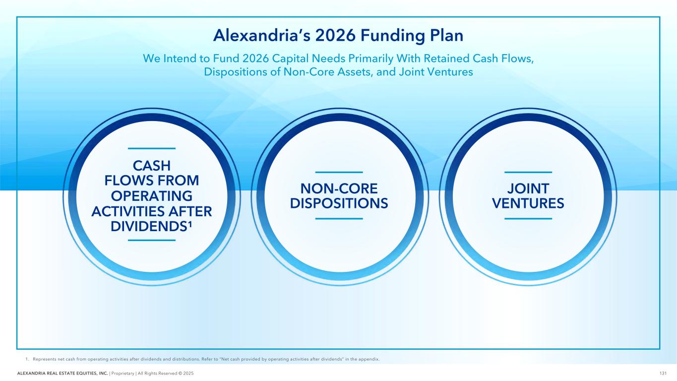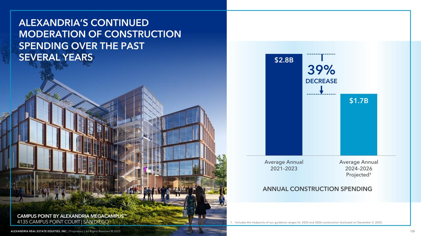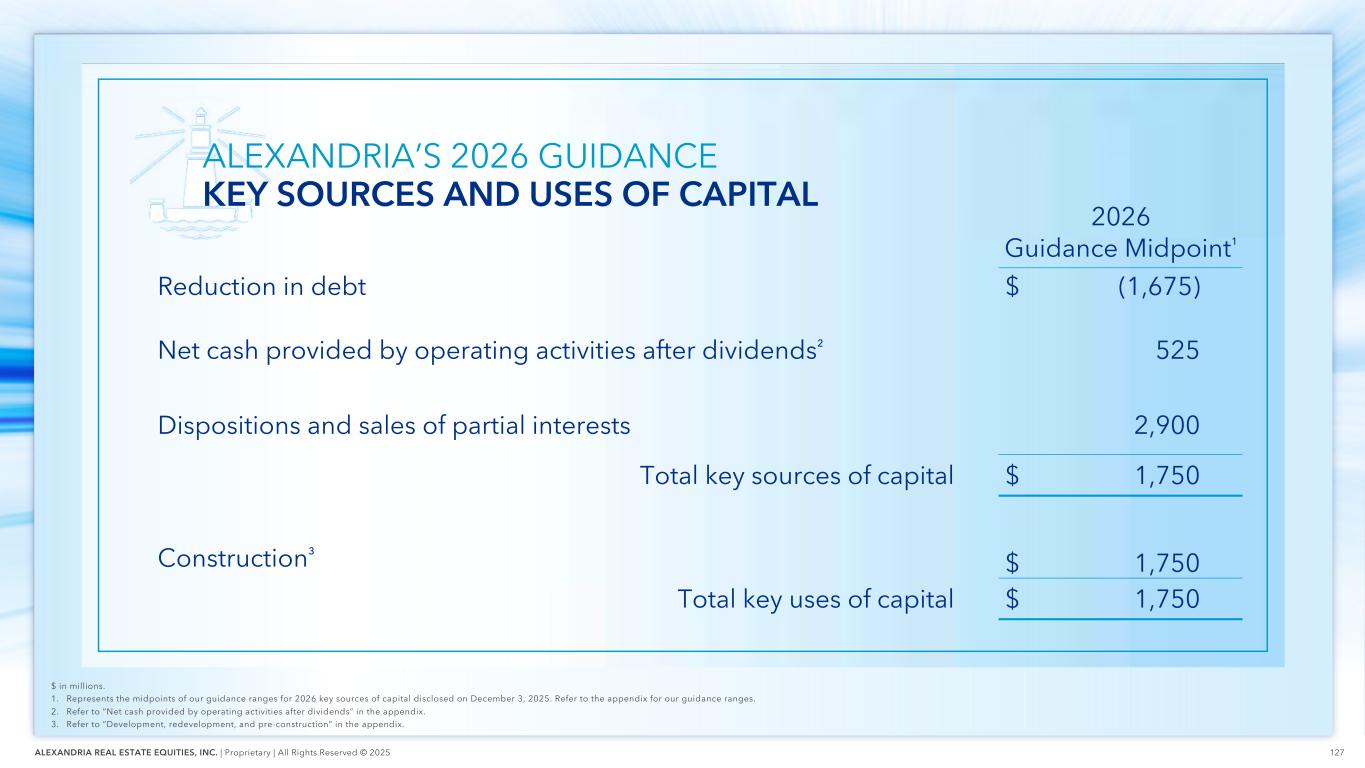 127ALEXANDRIA REAL ESTATE EQUITIES, INC. | Proprietary | All Rights Reserved © 2025 $ in millions. 1. Represents the midpoints of our guidance ranges for 2026 key sources of capital disclosed on December 3, 2025. Refer to the appendix for our guidance ranges. 2. Refer to “Net cash provided by operating activities after dividends” in the appendix. 3. Refer to “Development, redevelopment, and pre-construction” in the appendix. 2026 Guidance Midpoint¹ Reduction in debt $ (1,675) Net cash provided by operating activities after dividends² 525 Dispositions and sales of partial interests 2,900 Total key sources of capital $ 1,750 $ 1,750Construction³ Total key uses of capital $ 1,750 ALEXANDRIA’S 2026 GUIDANCE KEY SOURCES AND USES OF CAPITAL