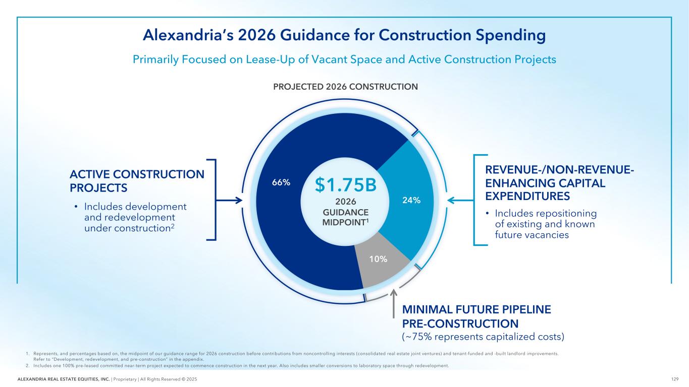 128ALEXANDRIA REAL ESTATE EQUITIES, INC. | Proprietary | All Rights Reserved © 2025 CAMPUS POINT BY ALEXANDRIA MEGACAMPUS™ 4135 CAMPUS POINT COURT | SAN DIEGO ALEXANDRIA’S CONTINUED MODERATION OF CONSTRUCTION SPENDING OVER THE PAST SEVERAL YEARS $2.8B $1.7B Average Annual 2021–2023 Average Annual 2024–2026 Projected¹ ANNUAL CONSTRUCTION SPENDING 39% DECREASE 1. Includes the midpoints of our guidance ranges for 2025 and 2026 construction disclosed on December 3, 2025.