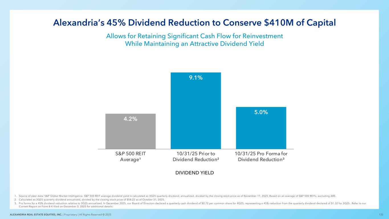 132ALEXANDRIA REAL ESTATE EQUITIES, INC. | Proprietary | All Rights Reserved © 2025 2026 Self-Funding and Capital Recycling Strategy 1. In December 2025, our Board of Directors declared a quarterly cash dividend of $0.72 per common share for 4Q25, representing a 45% reduction from the quarterly dividend declared of $1.32 for 3Q25. Refer to our Current Report on Form 8-K filed on December 3, 2025 for additional details. 2. Represents or based on the midpoints of our guidance ranges for 2026 key sources and uses of capital, 2026 dispositions and sales of partial interests, and net debt to Adjusted EBITDA – 4Q26 annualized disclosed on December 3, 2025. 2026 Self-Funding Sources 2026 Capital Needs 45% Dividend Reduction1 Dispositions and Sales of Partial Interests2 2026 Guidance Midpoint2 Key Sources of Capital Reduction in debt $ (1,075) $ – $ (600) $ (1,675) Net cash provided by operating activities after dividends 115 410 – 525 Dispositions and sales of partial interests – – 2,900 2,900 Funding needed to achieve leverage target 2,710 (410) (2,300) – $ 1,750 $ – $ – $ 1,750 Key Uses of Capital Construction $ 1,750 $ – $ – $ 1,750 $ 1,750 $ – $ – $ 1,750 Range for Net Debt to Adjusted EBITDA – 4Q26 Annualized 5.6x–6.2x 5.6x–6.2x