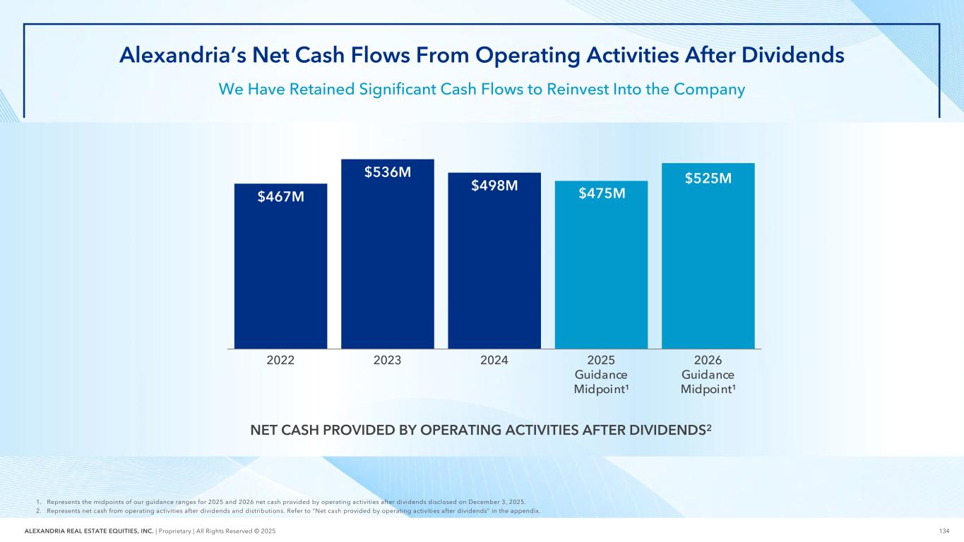 134ALEXANDRIA REAL ESTATE EQUITIES, INC. | Proprietary | All Rights Reserved © 2025 Alexandria’s Net Cash Flows From Operating Activities After Dividends We Have Retained Significant Cash Flows to Reinvest Into the Company 1. Represents the midpoints of our guidance ranges for 2025 and 2026 net cash provided by operating activities after dividends disclosed on December 3, 2025. 2. Represents net cash from operating activities after dividends and distributions. Refer to “Net cash provided by operating activities after dividends” in the appendix. $467M $536M $498M $475M $525M 2022 2023 2024 2025 Guidance Midpoint¹ 2026 Guidance Midpoint¹ NET CASH PROVIDED BY OPERATING ACTIVITIES AFTER DIVIDENDS2
