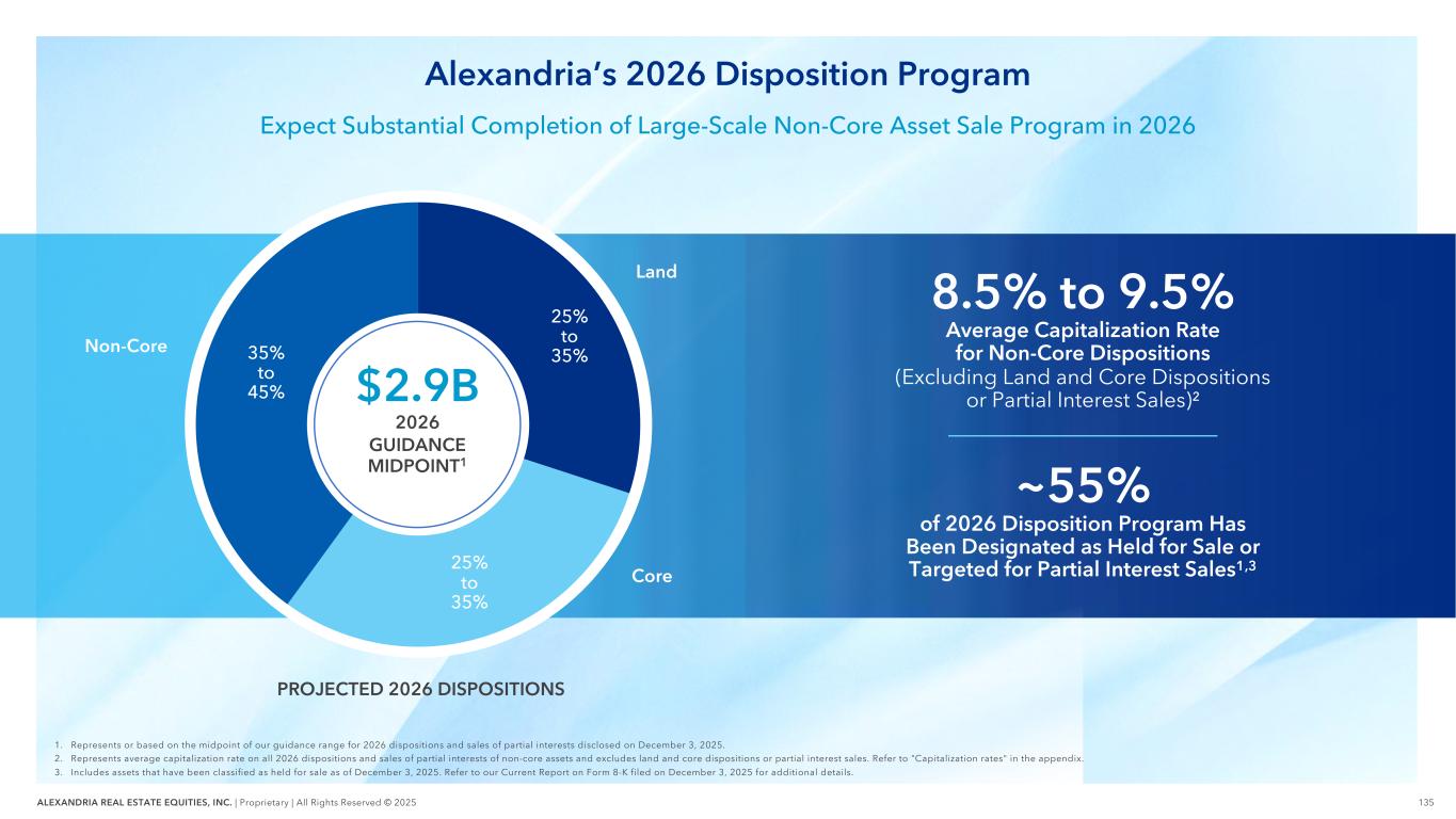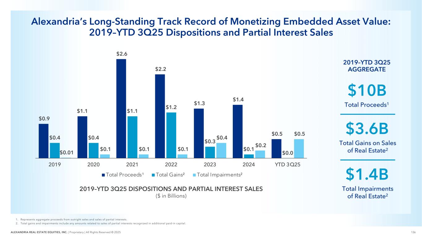 135ALEXANDRIA REAL ESTATE EQUITIES, INC. | Proprietary | All Rights Reserved © 2025 Alexandria’s 2026 Disposition Program Expect Substantial Completion of Large-Scale Non-Core Asset Sale Program in 2026 1. Represents or based on the midpoint of our guidance range for 2026 dispositions and sales of partial interests disclosed on December 3, 2025. 2. Represents average capitalization rate on all 2026 dispositions and sales of partial interests of non-core assets and excludes land and core dispositions or partial interest sales. Refer to "Capitalization rates" in the appendix. 3. Includes assets that have been classified as held for sale as of December 3, 2025. Refer to our Current Report on Form 8-K filed on December 3, 2025 for additional details. 25% to 35% 25% to 35% 35% to 45% $2.9B 2026 GUIDANCE MIDPOINT1 Land Non-Core Core PROJECTED 2026 DISPOSITIONS ~55% of 2026 Disposition Program Has Been Designated as Held for Sale or Targeted for Partial Interest Sales1,3 8.5% to 9.5% Average Capitalization Rate for Non-Core Dispositions (Excluding Land and Core Dispositions or Partial Interest Sales)²