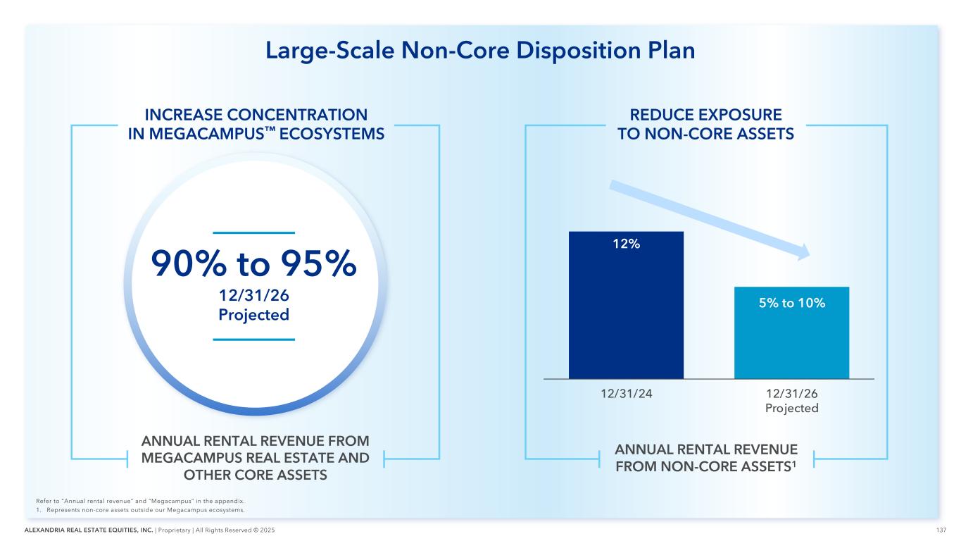 137ALEXANDRIA REAL ESTATE EQUITIES, INC. | Proprietary | All Rights Reserved © 2025 Large-Scale Non-Core Disposition Plan Refer to “Annual rental revenue” and “Megacampus” in the appendix. 1. Represents non-core assets outside our Megacampus ecosystems. ANNUAL RENTAL REVENUE FROM MEGACAMPUS REAL ESTATE AND OTHER CORE ASSETS REDUCE EXPOSURE TO NON-CORE ASSETS INCREASE CONCENTRATION IN MEGACAMPUS™ ECOSYSTEMS 12% 5% to 10% 12/31/24 12/31/26 Projected ANNUAL RENTAL REVENUE FROM NON-CORE ASSETS1 90% to 95% 12/31/26 Projected