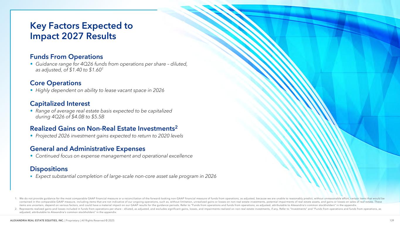 139ALEXANDRIA REAL ESTATE EQUITIES, INC. | Proprietary | All Rights Reserved © 2025 Funds From Operations • Guidance range for 4Q26 funds from operations per share – diluted, as adjusted, of $1.40 to $1.601 Core Operations • Highly dependent on ability to lease vacant space in 2026 Capitalized Interest • Range of average real estate basis expected to be capitalized during 4Q26 of $4.0B to $5.5B Realized Gains on Non-Real Estate Investments2 • Projected 2026 investment gains expected to return to 2020 levels General and Administrative Expenses • Continued focus on expense management and operational excellence Dispositions • Expect substantial completion of large-scale non-core asset sale program in 2026 Key Factors Expected to Impact 2027 Results 1. We do not provide guidance for the most comparable GAAP financial measure or a reconciliation of the forward-looking non-GAAP financial measure of funds from operations, as adjusted, because we are unable to reasonably predict, without unreasonable effort, certain items that would be contained in the comparable GAAP measure, including items that are not indicative of our ongoing operations, such as, without limitation, unrealized gains or losses on non-real estate investments, potential impairments of real estate assets, and gains or losses on sales of real estate. These items are uncertain, depend on various factors, and could have a material impact on our GAAP results for the guidance periods. Refer to “Funds from operations and funds from operations, as adjusted, attributable to Alexandria’s common stockholders” in the appendix. 2. Represents realized gains and losses included in funds from operations per share – diluted, as adjusted, and excludes significant gains, losses, and impairments realized on non-real estate investments, if any. Refer to “Investments” and “Funds from operations and funds from operations, as adjusted, attributable to Alexandria’s common stockholders” in the appendix.