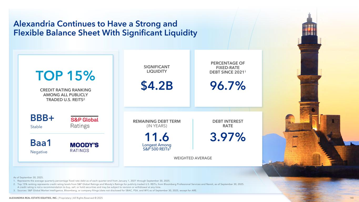 140ALEXANDRIA REAL ESTATE EQUITIES, INC. | Proprietary | All Rights Reserved © 2025 Alexandria Continues to Have a Strong and Flexible Balance Sheet With Significant Liquidity As of September 30, 2025. 1. Represents the average quarterly percentage fixed-rate debt as of each quarter-end from January 1, 2021 through September 30, 2025. 2. Top 15% ranking represents credit rating levels from S&P Global Ratings and Moody’s Ratings for publicly traded U.S. REITs, from Bloomberg Professional Services and Nareit, as of September 30, 2025. A credit rating is not a recommendation to buy, sell, or hold securities and may be subject to revision or withdrawal at any time. 3. Sources: S&P Global Market Intelligence, Bloomberg, or company filings (data not disclosed for SBAC, PSA, and WY) as of September 30, 2025, except for ARE. TOP 15% BBB+ Stable Baa1 Negative CREDIT RATING RANKING AMONG ALL PUBLICLY TRADED U.S. REITS2 WEIGHTED AVERAGE REMAINING DEBT TERM (IN YEARS) 11.6 3.97% PERCENTAGE OF FIXED-RATE DEBT SINCE 20211 96.7% SIGNIFICANT LIQUIDITY DEBT INTEREST RATE $4.2B Longest Among S&P 500 REITs3