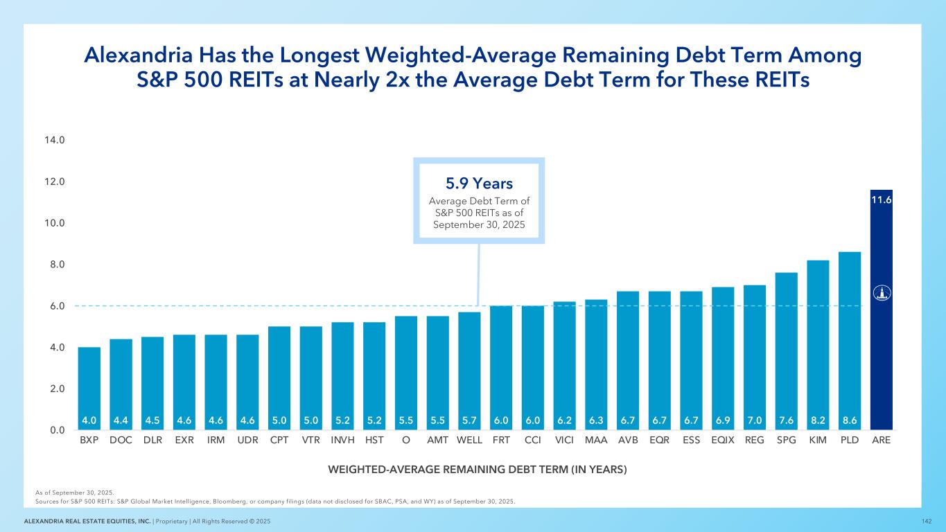 142ALEXANDRIA REAL ESTATE EQUITIES, INC. | Proprietary | All Rights Reserved © 2025 Alexandria Has the Longest Weighted-Average Remaining Debt Term Among S&P 500 REITs at Nearly 2x the Average Debt Term for These REITs As of September 30, 2025. Sources for S&P 500 REITs: S&P Global Market Intelligence, Bloomberg, or company filings (data not disclosed for SBAC, PSA, and WY) as of September 30, 2025. 4.0 4.4 4.5 4.6 4.6 4.6 5.0 5.0 5.2 5.2 5.5 5.5 5.7 6.0 6.0 6.2 6.3 6.7 6.7 6.7 6.9 7.0 7.6 8.2 8.6 11.6 0.0 2.0 4.0 6.0 8.0 10.0 12.0 14.0 BXP DOC DLR EXR IRM UDR CPT VTR INVH HST O AMT WELL FRT CCI VICI MAA AVB EQR ESS EQIX REG SPG KIM PLD ARE WEIGHTED-AVERAGE REMAINING DEBT TERM (IN YEARS) 5.9 Years Average Debt Term of S&P 500 REITs as of September 30, 2025