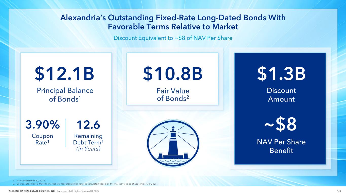 143ALEXANDRIA REAL ESTATE EQUITIES, INC. | Proprietary | All Rights Reserved © 2025 Alexandria’s Outstanding Fixed-Rate Long-Dated Bonds With Favorable Terms Relative to Market Discount Equivalent to ~$8 of NAV Per Share 1. As of September 30, 2025. 2. Source: Bloomberg. Mark-to-market of unsecured senior notes is calculated based on the market value as of September 30, 2025. $12.1B Principal Balance of Bonds1 $10.8B Fair Value of Bonds2 $1.3B Discount Amount ~$8 NAV Per Share Benefit 3.90% Coupon Rate1 12.6 Remaining Debt Term1 (in Years)