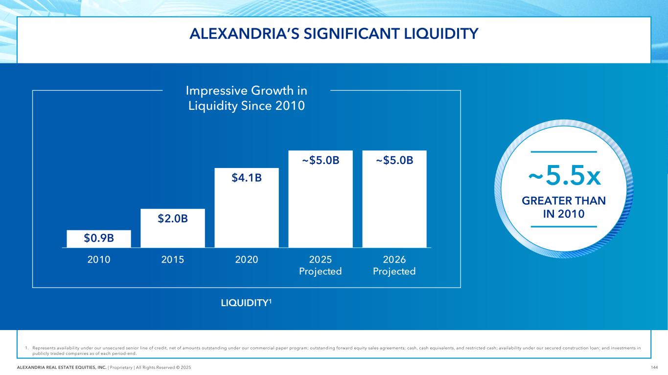 144ALEXANDRIA REAL ESTATE EQUITIES, INC. | Proprietary | All Rights Reserved © 2025 ALEXANDRIA’S SIGNIFICANT LIQUIDITY 1. Represents availability under our unsecured senior line of credit, net of amounts outstanding under our commercial paper program; outstanding forward equity sales agreements; cash, cash equivalents, and restricted cash; availability under our secured construction loan; and investments in publicly traded companies as of each period-end. LIQUIDITY1 Impressive Growth in Liquidity Since 2010 $0.9B $2.0B $4.1B ~$5.0B ~$5.0B 2010 2015 2020 2025 Projected 2026 Projected GREATER THAN IN 2010 ~5.5x