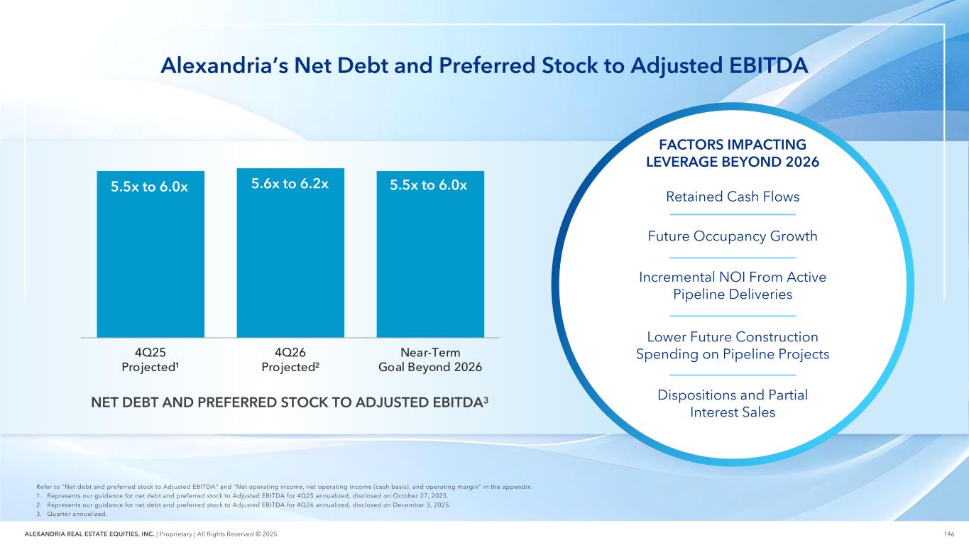 145ALEXANDRIA REAL ESTATE EQUITIES, INC. | Proprietary | All Rights Reserved © 2025 2026 GUIDANCE RANGES 5.6x TO 6.2x FIXED-CHARGE COVERAGE RATIO 3.6x TO 4.1x NET DEBT AND PREFERRED STOCK TO ADJUSTED EBITDA Represents 4Q26 annualized. Refer to “Net debt and preferred stock to Adjusted EBITDA“ and “Fixed-charge coverage ratio“ in the appendix. ALEXANDRIA’S 2026 GUIDANCE CREDIT METRICS