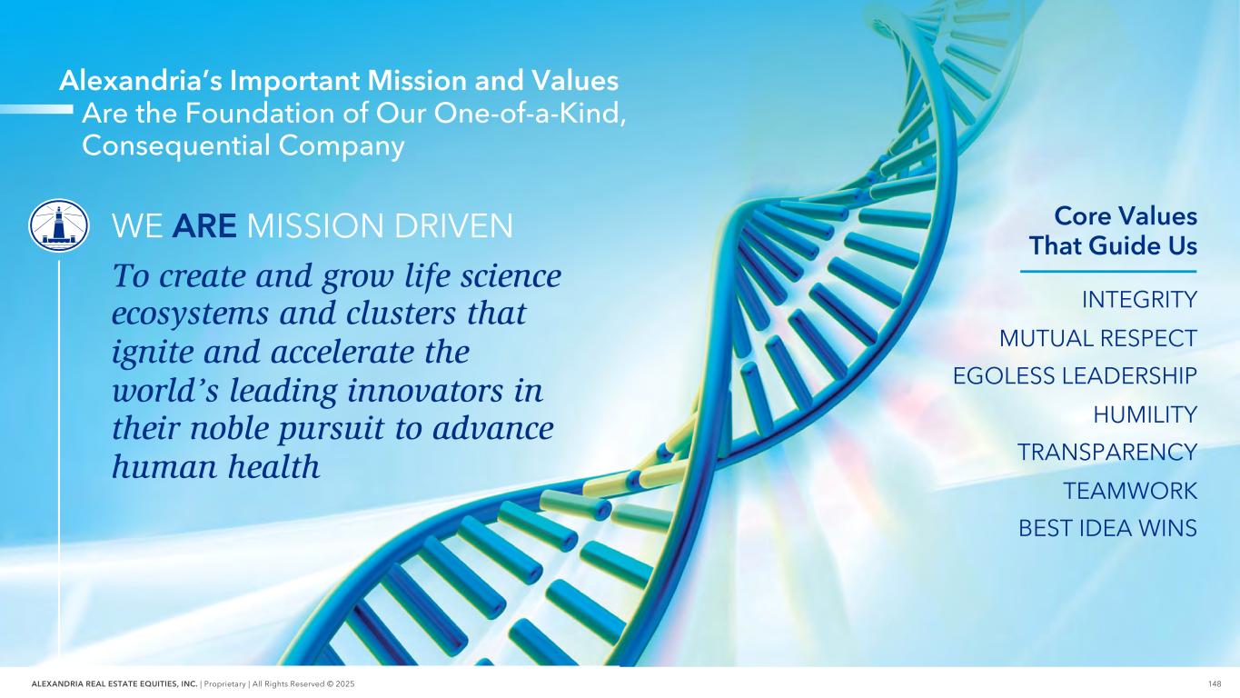 148ALEXANDRIA REAL ESTATE EQUITIES, INC. | Proprietary | All Rights Reserved © 2025 Alexandria’s Important Mission and Values Are the Foundation of Our One-of-a-Kind, Consequential Company WE ARE MISSION DRIVEN To create and grow life science ecosystems and clusters that ignite and accelerate the world’s leading innovators in their noble pursuit to advance human health Core Values That Guide Us INTEGRITY MUTUAL RESPECT EGOLESS LEADERSHIP HUMILITY TRANSPARENCY TEAMWORK BEST IDEA WINS
