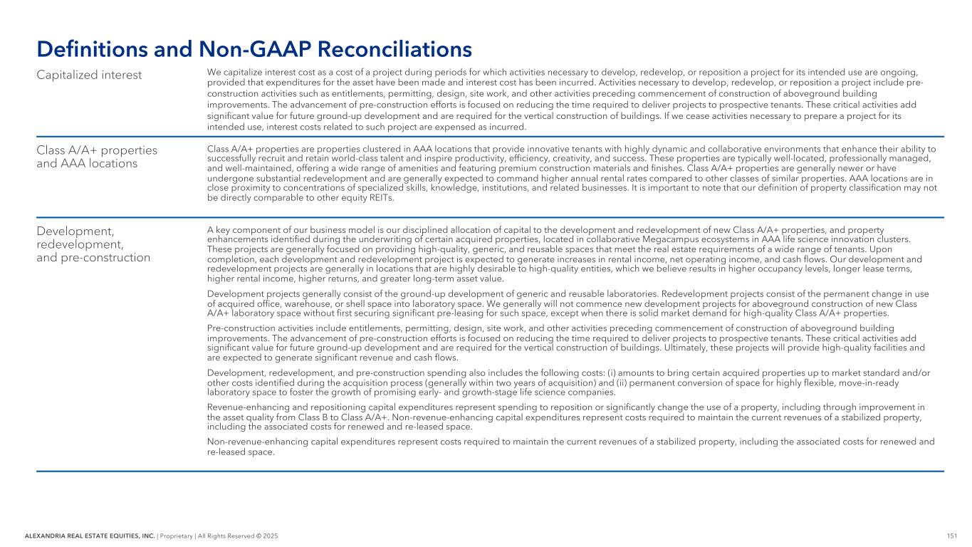 151ALEXANDRIA REAL ESTATE EQUITIES, INC. | Proprietary | All Rights Reserved © 2025 Definitions and Non-GAAP Reconciliations Capitalized interest We capitalize interest cost as a cost of a project during periods for which activities necessary to develop, redevelop, or reposition a project for its intended use are ongoing, provided that expenditures for the asset have been made and interest cost has been incurred. Activities necessary to develop, redevelop, or reposition a project include pre- construction activities such as entitlements, permitting, design, site work, and other activities preceding commencement of construction of aboveground building improvements. The advancement of pre-construction efforts is focused on reducing the time required to deliver projects to prospective tenants. These critical activities add significant value for future ground-up development and are required for the vertical construction of buildings. If we cease activities necessary to prepare a project for its intended use, interest costs related to such project are expensed as incurred. Class A/A+ properties and AAA locations Class A/A+ properties are properties clustered in AAA locations that provide innovative tenants with highly dynamic and collaborative environments that enhance their ability to successfully recruit and retain world-class talent and inspire productivity, efficiency, creativity, and success. These properties are typically well-located, professionally managed, and well-maintained, offering a wide range of amenities and featuring premium construction materials and finishes. Class A/A+ properties are generally newer or have undergone substantial redevelopment and are generally expected to command higher annual rental rates compared to other classes of similar properties. AAA locations are in close proximity to concentrations of specialized skills, knowledge, institutions, and related businesses. It is important to note that our definition of property classification may not be directly comparable to other equity REITs. Development, redevelopment, and pre-construction A key component of our business model is our disciplined allocation of capital to the development and redevelopment of new Class A/A+ properties, and property enhancements identified during the underwriting of certain acquired properties, located in collaborative Megacampus ecosystems in AAA life science innovation clusters. These projects are generally focused on providing high-quality, generic, and reusable spaces that meet the real estate requirements of a wide range of tenants. Upon completion, each development and redevelopment project is expected to generate increases in rental income, net operating income, and cash flows. Our development and redevelopment projects are generally in locations that are highly desirable to high-quality entities, which we believe results in higher occupancy levels, longer lease terms, higher rental income, higher returns, and greater long-term asset value. Development projects generally consist of the ground-up development of generic and reusable laboratories. Redevelopment projects consist of the permanent change in use of acquired office, warehouse, or shell space into laboratory space. We generally will not commence new development projects for aboveground construction of new Class A/A+ laboratory space without first securing significant pre-leasing for such space, except when there is solid market demand for high-quality Class A/A+ properties. Pre-construction activities include entitlements, permitting, design, site work, and other activities preceding commencement of construction of aboveground building improvements. The advancement of pre-construction efforts is focused on reducing the time required to deliver projects to prospective tenants. These critical activities add significant value for future ground-up development and are required for the vertical construction of buildings. Ultimately, these projects will provide high-quality facilities and are expected to generate significant revenue and cash flows. Development, redevelopment, and pre-construction spending also includes the following costs: (i) amounts to bring certain acquired properties up to market standard and/or other costs identified during the acquisition process (generally within two years of acquisition) and (ii) permanent conversion of space for highly flexible, move-in-ready laboratory space to foster the growth of promising early- and growth-stage life science companies. Revenue-enhancing and repositioning capital expenditures represent spending to reposition or significantly change the use of a property, including through improvement in the asset quality from Class B to Class A/A+. Non-revenue-enhancing capital expenditures represent costs required to maintain the current revenues of a stabilized property, including the associated costs for renewed and re-leased space. Non-revenue-enhancing capital expenditures represent costs required to maintain the current revenues of a stabilized property, including the associated costs for renewed and re-leased space.