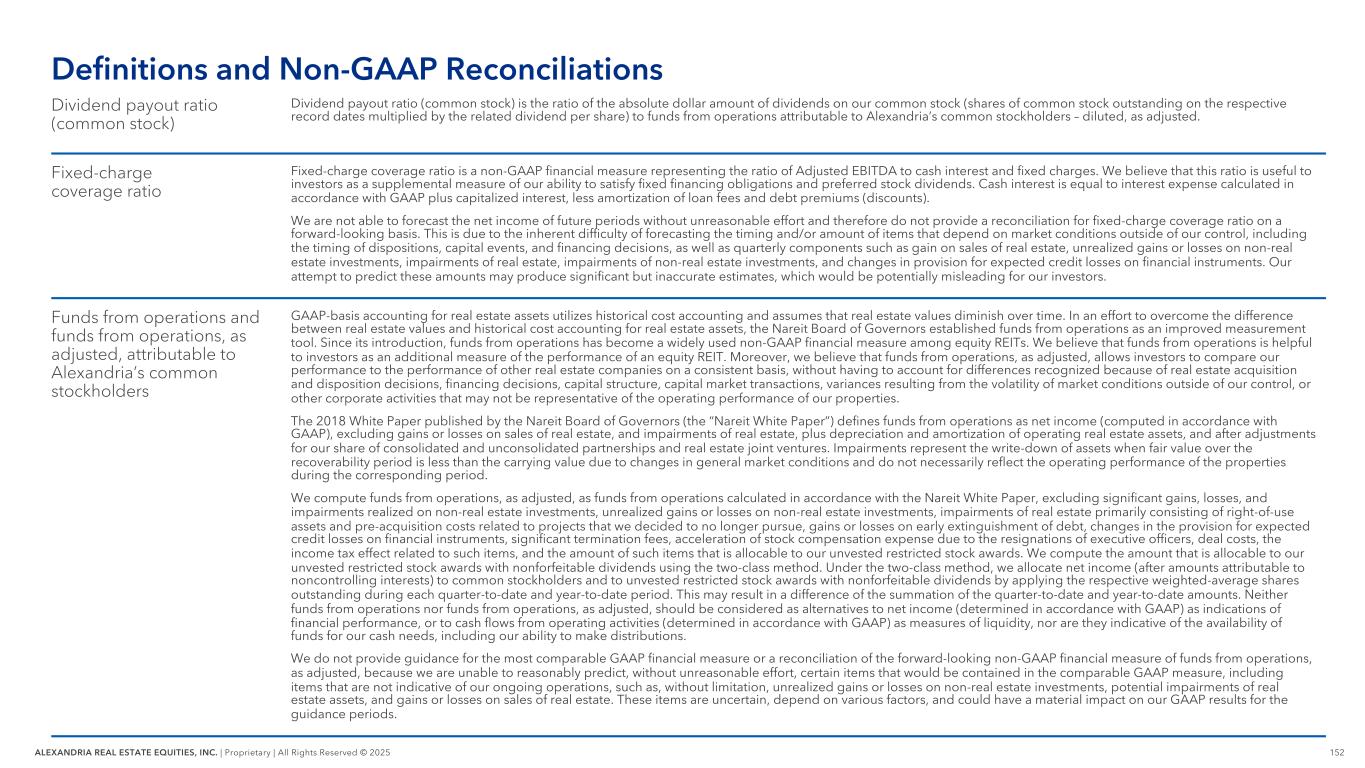 152ALEXANDRIA REAL ESTATE EQUITIES, INC. | Proprietary | All Rights Reserved © 2025 Definitions and Non-GAAP Reconciliations Dividend payout ratio (common stock) Dividend payout ratio (common stock) is the ratio of the absolute dollar amount of dividends on our common stock (shares of common stock outstanding on the respective record dates multiplied by the related dividend per share) to funds from operations attributable to Alexandria’s common stockholders – diluted, as adjusted. Fixed-charge coverage ratio Fixed-charge coverage ratio is a non-GAAP financial measure representing the ratio of Adjusted EBITDA to cash interest and fixed charges. We believe that this ratio is useful to investors as a supplemental measure of our ability to satisfy fixed financing obligations and preferred stock dividends. Cash interest is equal to interest expense calculated in accordance with GAAP plus capitalized interest, less amortization of loan fees and debt premiums (discounts). We are not able to forecast the net income of future periods without unreasonable effort and therefore do not provide a reconciliation for fixed-charge coverage ratio on a forward-looking basis. This is due to the inherent difficulty of forecasting the timing and/or amount of items that depend on market conditions outside of our control, including the timing of dispositions, capital events, and financing decisions, as well as quarterly components such as gain on sales of real estate, unrealized gains or losses on non-real estate investments, impairments of real estate, impairments of non-real estate investments, and changes in provision for expected credit losses on financial instruments. Our attempt to predict these amounts may produce significant but inaccurate estimates, which would be potentially misleading for our investors. Funds from operations and funds from operations, as adjusted, attributable to Alexandria’s common stockholders GAAP-basis accounting for real estate assets utilizes historical cost accounting and assumes that real estate values diminish over time. In an effort to overcome the difference between real estate values and historical cost accounting for real estate assets, the Nareit Board of Governors established funds from operations as an improved measurement tool. Since its introduction, funds from operations has become a widely used non-GAAP financial measure among equity REITs. We believe that funds from operations is helpful to investors as an additional measure of the performance of an equity REIT. Moreover, we believe that funds from operations, as adjusted, allows investors to compare our performance to the performance of other real estate companies on a consistent basis, without having to account for differences recognized because of real estate acquisition and disposition decisions, financing decisions, capital structure, capital market transactions, variances resulting from the volatility of market conditions outside of our control, or other corporate activities that may not be representative of the operating performance of our properties. The 2018 White Paper published by the Nareit Board of Governors (the “Nareit White Paper”) defines funds from operations as net income (computed in accordance with GAAP), excluding gains or losses on sales of real estate, and impairments of real estate, plus depreciation and amortization of operating real estate assets, and after adjustments for our share of consolidated and unconsolidated partnerships and real estate joint ventures. Impairments represent the write-down of assets when fair value over the recoverability period is less than the carrying value due to changes in general market conditions and do not necessarily reflect the operating performance of the properties during the corresponding period. We compute funds from operations, as adjusted, as funds from operations calculated in accordance with the Nareit White Paper, excluding significant gains, losses, and impairments realized on non-real estate investments, unrealized gains or losses on non-real estate investments, impairments of real estate primarily consisting of right-of-use assets and pre-acquisition costs related to projects that we decided to no longer pursue, gains or losses on early extinguishment of debt, changes in the provision for expected credit losses on financial instruments, significant termination fees, acceleration of stock compensation expense due to the resignations of executive officers, deal costs, the income tax effect related to such items, and the amount of such items that is allocable to our unvested restricted stock awards. We compute the amount that is allocable to our unvested restricted stock awards with nonforfeitable dividends using the two-class method. Under the two-class method, we allocate net income (after amounts attributable to noncontrolling interests) to common stockholders and to unvested restricted stock awards with nonforfeitable dividends by applying the respective weighted-average shares outstanding during each quarter-to-date and year-to-date period. This may result in a difference of the summation of the quarter-to-date and year-to-date amounts. Neither funds from operations nor funds from operations, as adjusted, should be considered as alternatives to net income (determined in accordance with GAAP) as indications of financial performance, or to cash flows from operating activities (determined in accordance with GAAP) as measures of liquidity, nor are they indicative of the availability of funds for our cash needs, including our ability to make distributions. We do not provide guidance for the most comparable GAAP financial measure or a reconciliation of the forward-looking non-GAAP financial measure of funds from operations, as adjusted, because we are unable to reasonably predict, without unreasonable effort, certain items that would be contained in the comparable GAAP measure, including items that are not indicative of our ongoing o