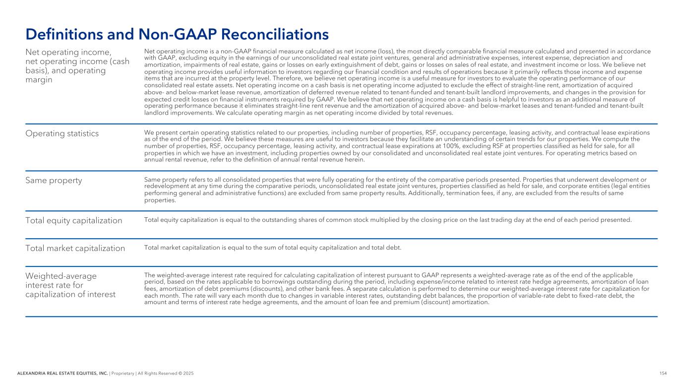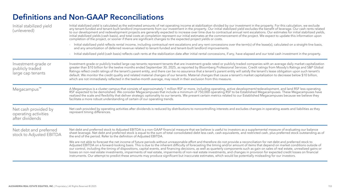 153ALEXANDRIA REAL ESTATE EQUITIES, INC. | Proprietary | All Rights Reserved © 2025 Definitions and Non-GAAP Reconciliations Initial stabilized yield (unlevered) Initial stabilized yield is calculated as the estimated amounts of net operating income at stabilization divided by our investment in the property. For this calculation, we exclude any tenant-funded and tenant-built landlord improvements from our investment in the property. Our initial stabilized yield excludes the benefit of leverage. Our cash rents related to our development and redevelopment projects are generally expected to increase over time due to contractual annual rent escalations. Our estimates for initial stabilized yields, initial stabilized yields (cash basis), and total costs at completion represent our initial estimates at the commencement of the project. We expect to update this information upon completion of the project, or sooner if there are significant changes to the expected project yields or costs. - Initial stabilized yield reflects rental income, including contractual rent escalations and any rent concessions over the term(s) of the lease(s), calculated on a straight-line basis, and any amortization of deferred revenue related to tenant-funded and tenant-built landlord improvements. - Initial stabilized yield (cash basis) reflects cash rents at the stabilization date after initial rental concessions, if any, have elapsed and our total cash investment in the property. Investment-grade or publicly traded large cap tenants Investment-grade or publicly traded large cap tenants represent tenants that are investment-grade rated or publicly traded companies with an average daily market capitalization greater than $10 billion for the twelve months ended September 30, 2025, as reported by Bloomberg Professional Services. Credit ratings from Moody’s Ratings and S&P Global Ratings reflect credit ratings of the tenant’s parent entity, and there can be no assurance that a tenant’s parent entity will satisfy the tenant’s lease obligation upon such tenant’s default. We monitor the credit quality and related material changes of our tenants. Material changes that cause a tenant’s market capitalization to decrease below $10 billion, which are not immediately reflected in the twelve-month average, may result in their exclusion from this measure. Megacampus™ A Megacampus is a cluster campus that consists of approximately 1 million RSF or more, including operating, active development/redevelopment, and land RSF less operating RSF expected to be demolished. We consider Megacampuses that include a minimum of 750,000 operating RSF to be Established Megacampuses. These Megacampuses have realized the scale and flexibility that deliver strategic optionality to our tenants. We present certain metrics related to our Established Megacampuses because we believe they facilitate a more robust understanding of certain of our operating trends. Net cash provided by operating activities after dividends Net cash provided by operating activities after dividends is reduced by distributions to noncontrolling interests and excludes changes in operating assets and liabilities as they represent timing differences. Net debt and preferred stock to Adjusted EBITDA Net debt and preferred stock to Adjusted EBITDA is a non-GAAP financial measure that we believe is useful to investors as a supplemental measure of evaluating our balance sheet leverage. Net debt and preferred stock is equal to the sum of total consolidated debt less cash, cash equivalents, and restricted cash, plus preferred stock outstanding as of the end of the period. Refer to the definition of Adjusted EBITDA. We are not able to forecast the net income of future periods without unreasonable effort and therefore do not provide a reconciliation for net debt and preferred stock to Adjusted EBITDA on a forward-looking basis. This is due to the inherent difficulty of forecasting the timing and/or amount of items that depend on market conditions outside of our control, including the timing of dispositions, capital events, and financing decisions, as well as quarterly components such as gain on sales of real estate, unrealized gains or losses on non-real estate investments, impairments of real estate, impairments of non-real estate investments, and changes in provision for expected credit losses on financial instruments. Our attempt to predict these amounts may produce significant but inaccurate estimates, which would be potentially misleading for our investors.