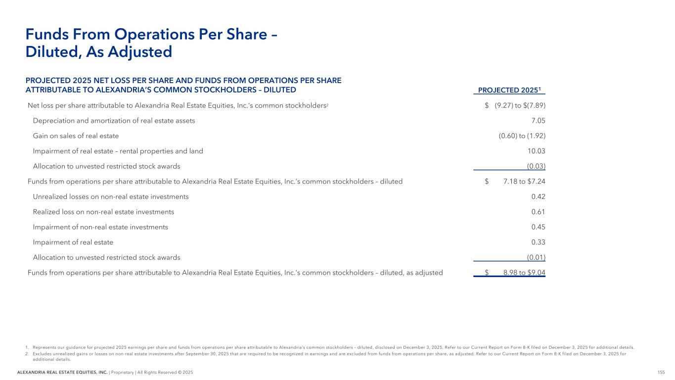 155ALEXANDRIA REAL ESTATE EQUITIES, INC. | Proprietary | All Rights Reserved © 2025 Funds From Operations Per Share – Diluted, As Adjusted 1. Represents our guidance for projected 2025 earnings per share and funds from operations per share attributable to Alexandria’s common stockholders – diluted, disclosed on December 3, 2025. Refer to our Current Report on Form 8-K filed on December 3, 2025 for additional details. 2. Excludes unrealized gains or losses on non-real estate investments after September 30, 2025 that are required to be recognized in earnings and are excluded from funds from operations per share, as adjusted. Refer to our Current Report on Form 8-K filed on December 3, 2025 for additional details. PROJECTED 2025 NET LOSS PER SHARE AND FUNDS FROM OPERATIONS PER SHARE ATTRIBUTABLE TO ALEXANDRIA’S COMMON STOCKHOLDERS – DILUTED PROJECTED 20251 Net loss per share attributable to Alexandria Real Estate Equities, Inc.’s common stockholders2 $ (9.27) to $(7.89) Depreciation and amortization of real estate assets 7.05 Gain on sales of real estate (0.60) to (1.92) Impairment of real estate – rental properties and land 10.03 Allocation to unvested restricted stock awards (0.03) Funds from operations per share attributable to Alexandria Real Estate Equities, Inc.’s common stockholders – diluted $ 7.18 to $7.24 Unrealized losses on non-real estate investments 0.42 Realized loss on non-real estate investments 0.61 Impairment of non-real estate investments 0.45 Impairment of real estate 0.33 Allocation to unvested restricted stock awards (0.01) Funds from operations per share attributable to Alexandria Real Estate Equities, Inc.’s common stockholders – diluted, as adjusted $ 8.98 to $9.04