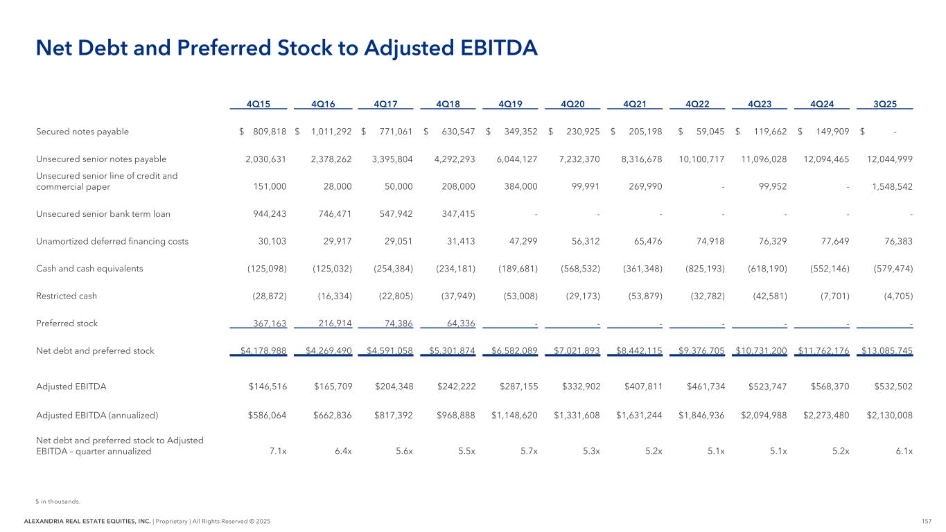 157ALEXANDRIA REAL ESTATE EQUITIES, INC. | Proprietary | All Rights Reserved © 2025 Net Debt and Preferred Stock to Adjusted EBITDA $ in thousands. 4Q15 4Q16 4Q17 4Q18 4Q19 4Q20 4Q21 4Q22 4Q23 4Q24 3Q25 Secured notes payable $ 809,818 $ 1,011,292 $ 771,061 $ 630,547 $ 349,352 $ 230,925 $ 205,198 $ 59,045 $ 119,662 $ 149,909 $ - Unsecured senior notes payable 2,030,631 2,378,262 3,395,804 4,292,293 6,044,127 7,232,370 8,316,678 10,100,717 11,096,028 12,094,465 12,044,999 Unsecured senior line of credit and commercial paper 151,000 28,000 50,000 208,000 384,000 99,991 269,990 - 99,952 - 1,548,542 Unsecured senior bank term loan 944,243 746,471 547,942 347,415 - - - - - - - Unamortized deferred financing costs 30,103 29,917 29,051 31,413 47,299 56,312 65,476 74,918 76,329 77,649 76,383 Cash and cash equivalents (125,098) (125,032) (254,384) (234,181) (189,681) (568,532) (361,348) (825,193) (618,190) (552,146) (579,474) Restricted cash (28,872) (16,334) (22,805) (37,949) (53,008) (29,173) (53,879) (32,782) (42,581) (7,701) (4,705) Preferred stock 367,163 216,914 74,386 64,336 - - - - - - - Net debt and preferred stock $4,178,988 $4,269,490 $4,591,058 $5,301,874 $6,582,089 $7,021,893 $8,442,115 $9,376,705 $10,731,200 $11,762,176 $13,085,745 Adjusted EBITDA $146,516 $165,709 $204,348 $242,222 $287,155 $332,902 $407,811 $461,734 $523,747 $568,370 $532,502 Adjusted EBITDA (annualized) $586,064 $662,836 $817,392 $968,888 $1,148,620 $1,331,608 $1,631,244 $1,846,936 $2,094,988 $2,273,480 $2,130,008 Net debt and preferred stock to Adjusted EBITDA – quarter annualized 7.1x 6.4x 5.6x 5.5x 5.7x 5.3x 5.2x 5.1x 5.1x 5.2x 6.1x