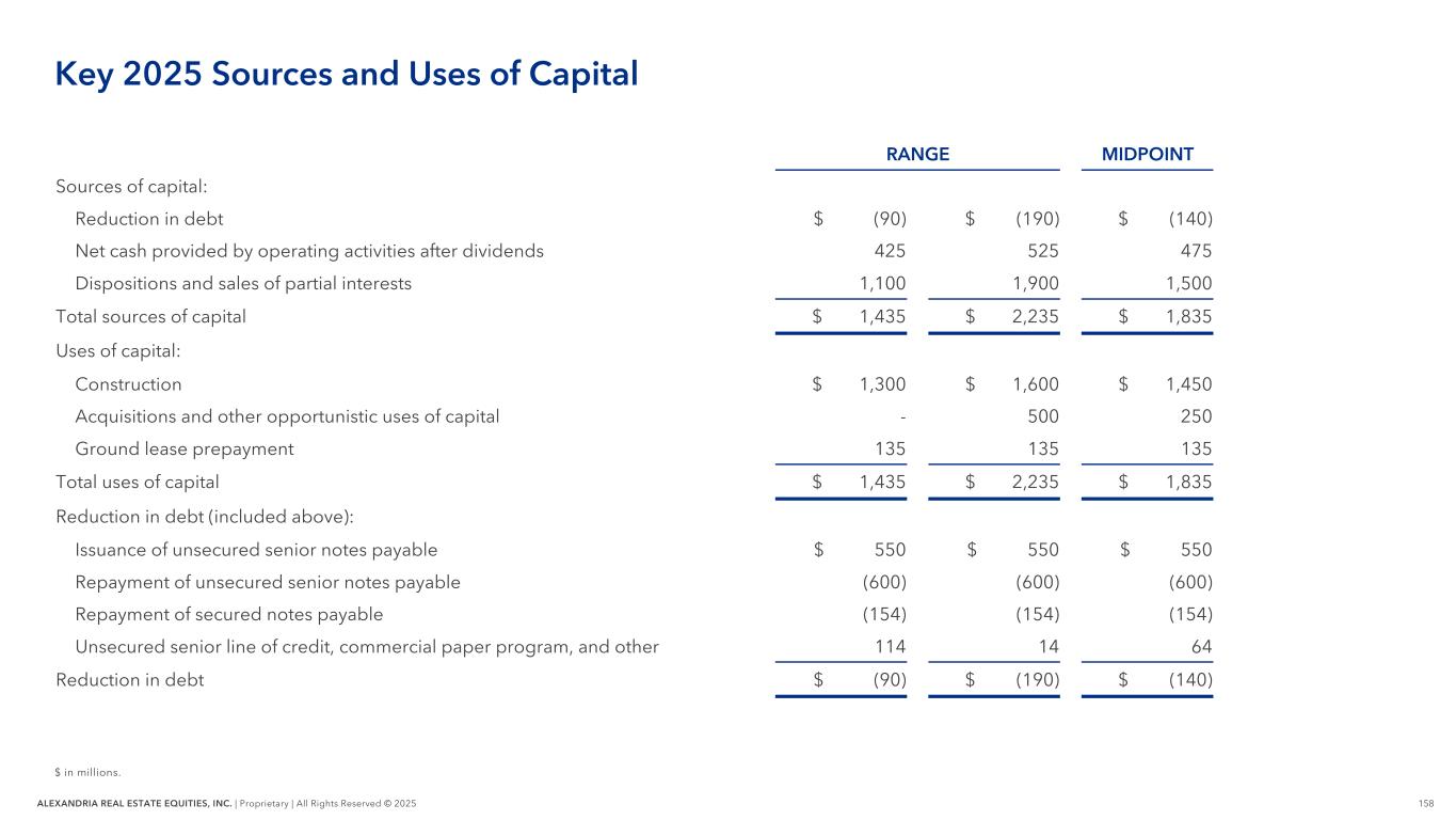 158ALEXANDRIA REAL ESTATE EQUITIES, INC. | Proprietary | All Rights Reserved © 2025 Key 2025 Sources and Uses of Capital $ in millions. RANGE MIDPOINT Sources of capital: Reduction in debt $ (90) $ (190) $ (140) Net cash provided by operating activities after dividends 425 525 475 Dispositions and sales of partial interests 1,100 1,900 1,500 Total sources of capital $ 1,435 $ 2,235 $ 1,835 Uses of capital: Construction $ 1,300 $ 1,600 $ 1,450 Acquisitions and other opportunistic uses of capital - 500 250 Ground lease prepayment 135 135 135 Total uses of capital $ 1,435 $ 2,235 $ 1,835 Reduction in debt (included above): Issuance of unsecured senior notes payable $ 550 $ 550 $ 550 Repayment of unsecured senior notes payable (600) (600) (600) Repayment of secured notes payable (154) (154) (154) Unsecured senior line of credit, commercial paper program, and other 114 14 64 Reduction in debt $ (90) $ (190) $ (140)