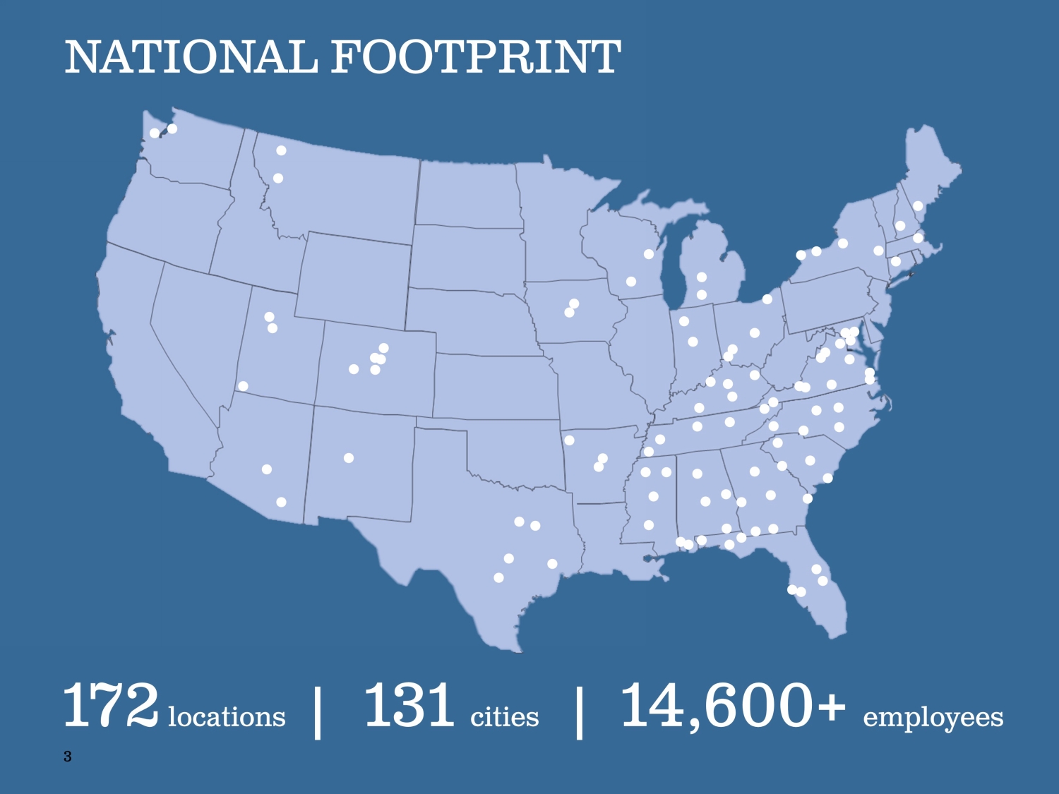 NATIONAL FOOTPRINT 3 172 locations | 131 cities | 14,600+ employees