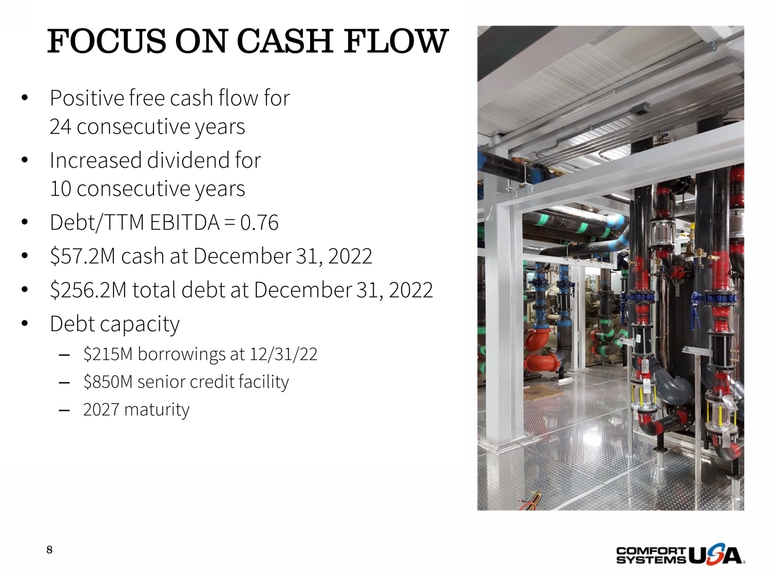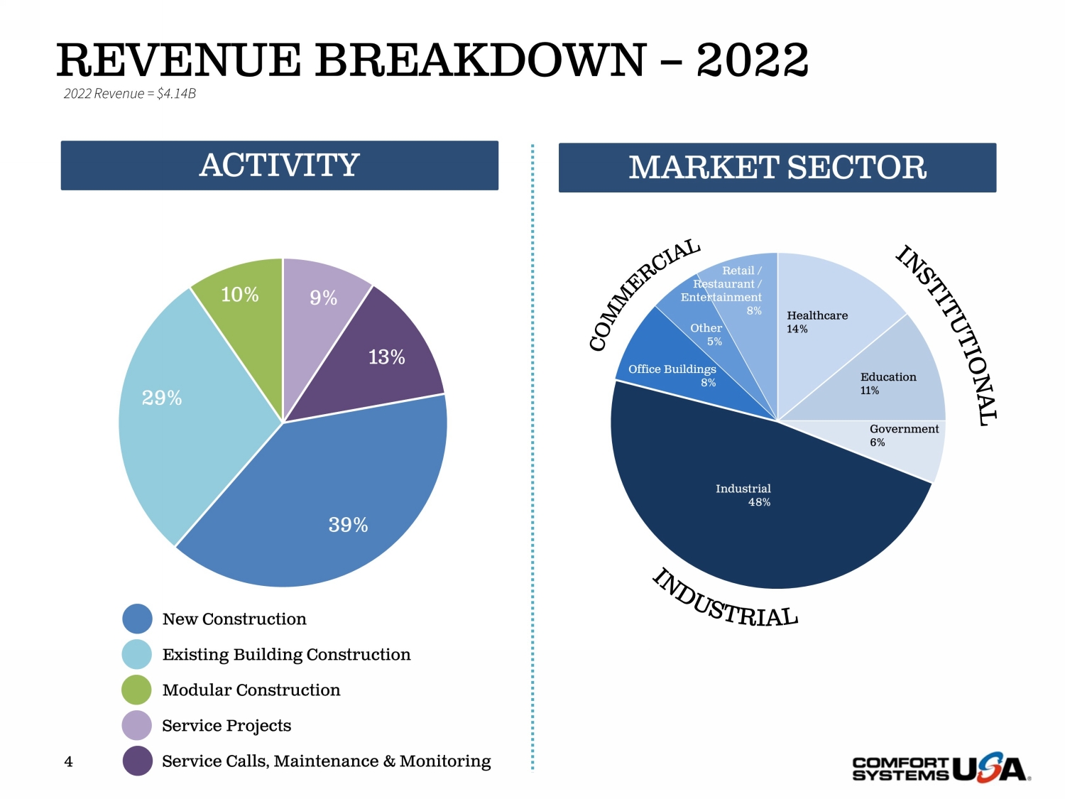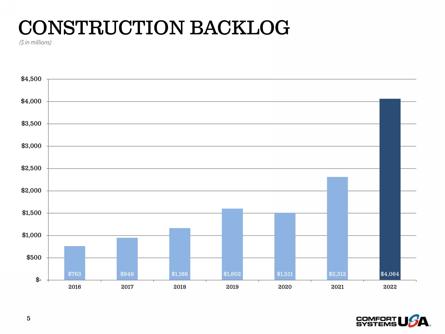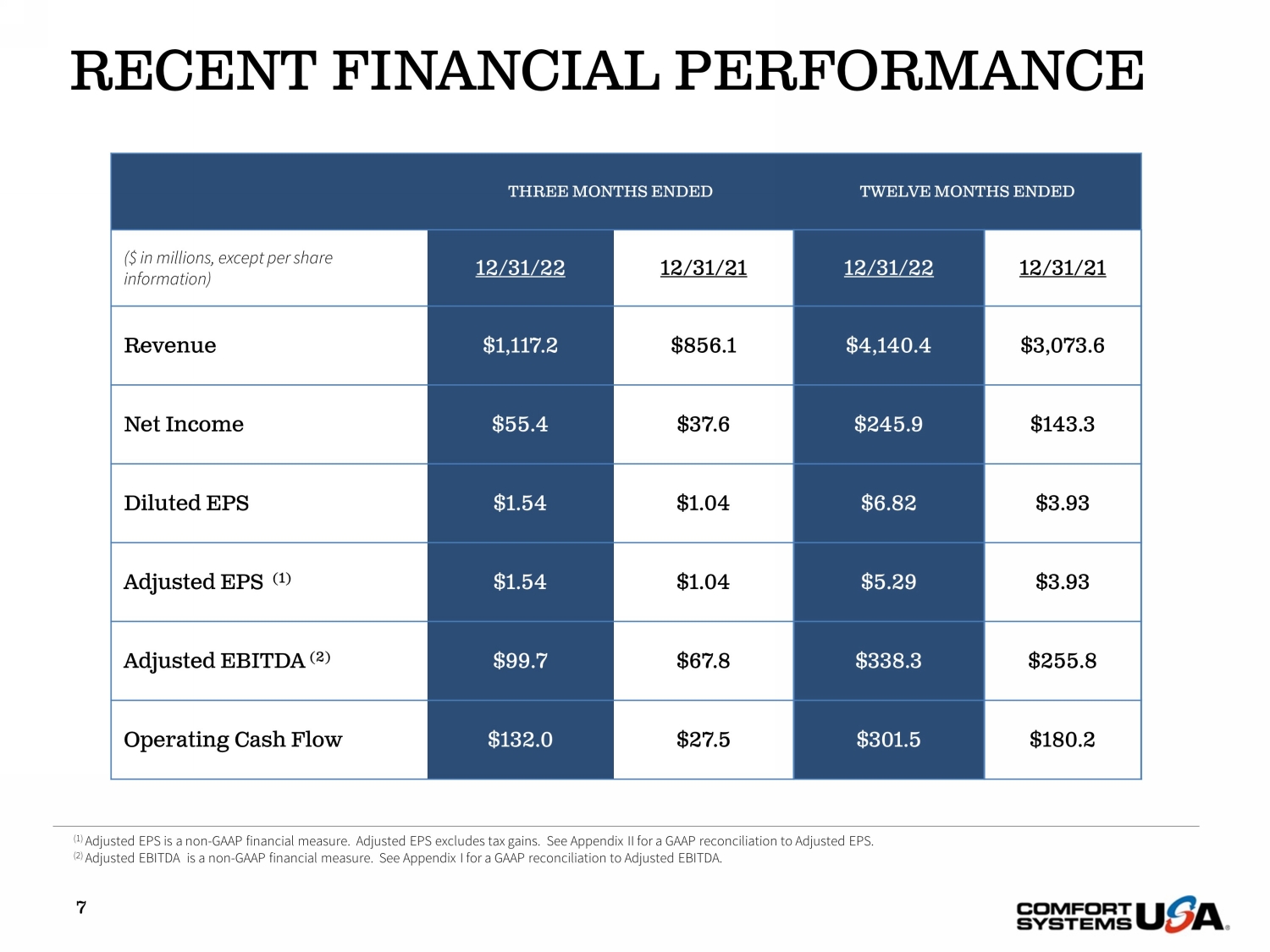 SAFE HARBOR Certain statements and information in this presentation may constitute forward - looking statements within the meaning of applicab le securities laws and regulations. The words “believe,” “expect,” “anticipate,” “plan,” “intend,” “foresee,” “should,” “would,” “could,” or oth er similar expressions are intended to identify forward - looking statements, which are generally not historic in nature. These forward - looking statements are based o n the current expectations and beliefs of Comfort Systems USA, Inc. and its subsidiaries (collectively, the “Company”) concerning future developments an d t heir effect on the Company. While the Company’s management believes that these forward - looking statements are reasonable as and when made, there can be no a ssurance that future developments affecting the Company will be those that it anticipates, and the Company’s actual results of operations, financi al condition and liquidity, and the development of the industry in which the Company operates, may differ materially from those made in or suggested by the f orw ard - looking statements contained in this presentation. In addition, even if our results of operations, financial condition and liquidity, and the d eve lopment of the industry in which we operate, are consistent with the forward - looking statements contained in this presentation, those results or developments may not be indicative of our results or developments in subsequent periods. All comments concerning the Company’s expectations for future revenue and ope rat ing results are based on the Company’s forecasts for its existing operations and do not include the potential impact of any future acquisitions. The C omp any’s forward - looking statements involve significant risks and uncertainties (some of which are beyond the Company’s control) and assumptions that cou ld cause actual future results to differ materially from the Company’s historical experience and its present expectations or projections. Important factors that could cause actual results to differ materially from those in the forward - looking statements include, bu t are not limited to: the use of incorrect estimates for bidding a fixed - price contract; undertaking contractual commitments that exceed the Company’s lab or resources; failing to perform contractual obligations efficiently enough to maintain profitability; national or regional weakness in construction a cti vity and economic conditions; rising inflation and fluctuations in interest rates; shortages of labor and specialty building materials or material increase s t o the cost thereof; the Company’s business being negatively affected by health crises or outbreaks of disease, such as epidemics or pandemics (and related impa cts , such as supply chain disruptions); financial difficulties affecting projects, vendors, customers, or subcontractors; the Company’s backlog failing to translate into actual revenue or profits; failure of third party subcontractors and suppliers to complete work as anticipated; difficulty in obtaining, or in cre ased costs associated with, bonding and insurance; impairment to goodwill; errors in the Company’s cost - to - cost input method of accounting; the result of co mpetition in the Company’s markets; the Company’s decentralized management structure; material failure to comply with varying state and local law s, regulations or requirements; debarment from bidding on or performing government contracts; retention of key management; seasonal fluctuation s i n the demand for mechanical and electrical systems; the imposition of past and future liability from environmental, safety, and health regulat ion s including the inherent risk associated with self - insurance; adverse litigation results; an increase in our effective tax rate; a material information techno logy failure or a material cyber security breach; risks associated with acquisitions, such as challenges to our ability to integrate those companies into our int ernal control environment; our ability to manage growth and geographically - dispersed operations; our ability to obtain financing on acceptable terms; extreme w eather conditions (such as storms, droughts, extreme heat or cold, wildfires and floods), including as a result of climate change, and any resulting reg ula tions or restrictions related thereto; and other risks detailed in our reports filed with the Securities and Exchange Commission (the “SEC”). For additional information regarding known material factors that could cause the Company’s results to differ from its project ed results, please see its filings with the SEC, including its Annual Report on Form 10 - K, Quarterly Reports on Form 10 - Q, and Current Reports on Form 8 - K. Readers are cautioned not to place undue reliance on forward - looking statements, which speak only as of the date hereof. The Company undertakes no obligat ion to publicly update or revise any forward - looking statements after the date they are made, whether as a result of new information, future events, or ot herwise. NON - GAAP MEASURES Certain measures in this presentation are not measures calculated in accordance with generally accepted accounting principles (“ GAAP”). They should not be considered a replacement for GAAP results. Non - GAAP financial measures appearing in these slides are identified in the footnote. See the Appendices for a reconciliation of these non - GAAP measures to the most comparable GAAP financial measures.